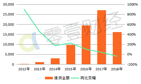 据零壹数据统计,截至2018年末P2P网贷行业累计借贷总额约为7.69万亿元。其中,2018年借贷总额为1.62万亿元,同比2017年(2.71万亿元)大幅减少40.3%。相比于2017年,除1月份借贷总额同比上升外,其余11个月份均有不同程度的下降。