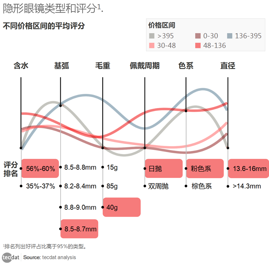 通过销量我们将价格区间划分成5个区间,其中价格区间48-136被最多用户关注(41%)。 我们观察到价格高于136的商品中,基弧和毛重的评分要高于其他价格区间的商品。在大众价格区间(136-395)中,除了基弧和毛重两个特征外,其他可以满足大部分用户的需求,在含水和佩戴周期的评分超过价格高于136商品。 价格在48以下的商品在佩戴周期、色系和直径方面的评分远低于大众和高价位的商品,在选购低价位商品时要特别关注这些方面。