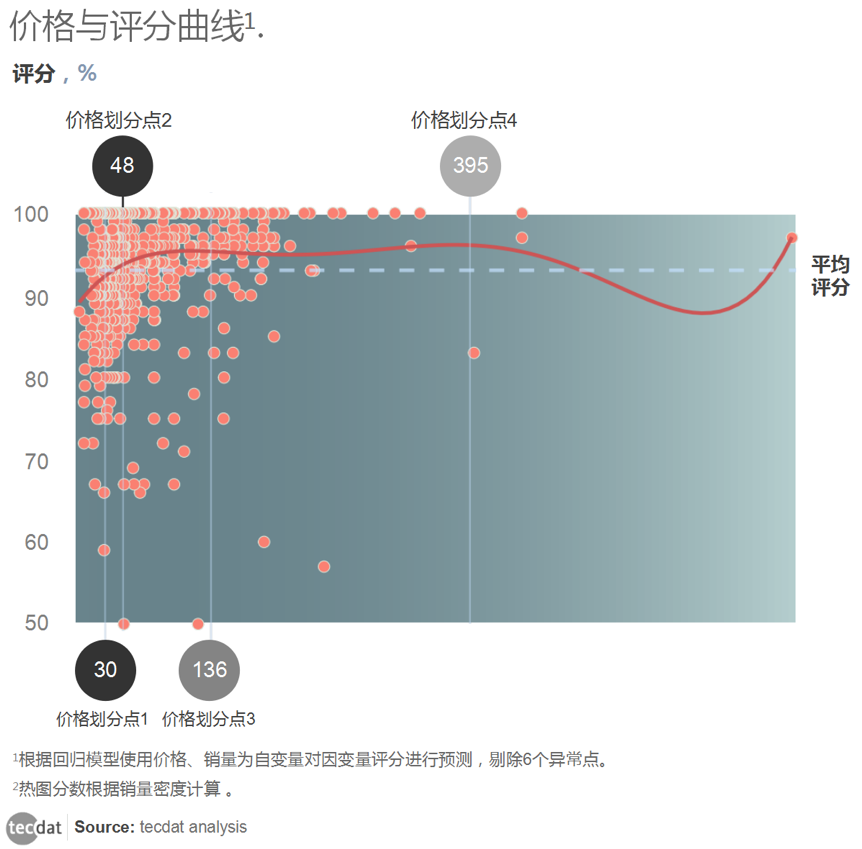 从各个方面的评分来看,价格为48-136的大众区间商品表现最为稳定,而高于136的商品的评分则层次不齐。