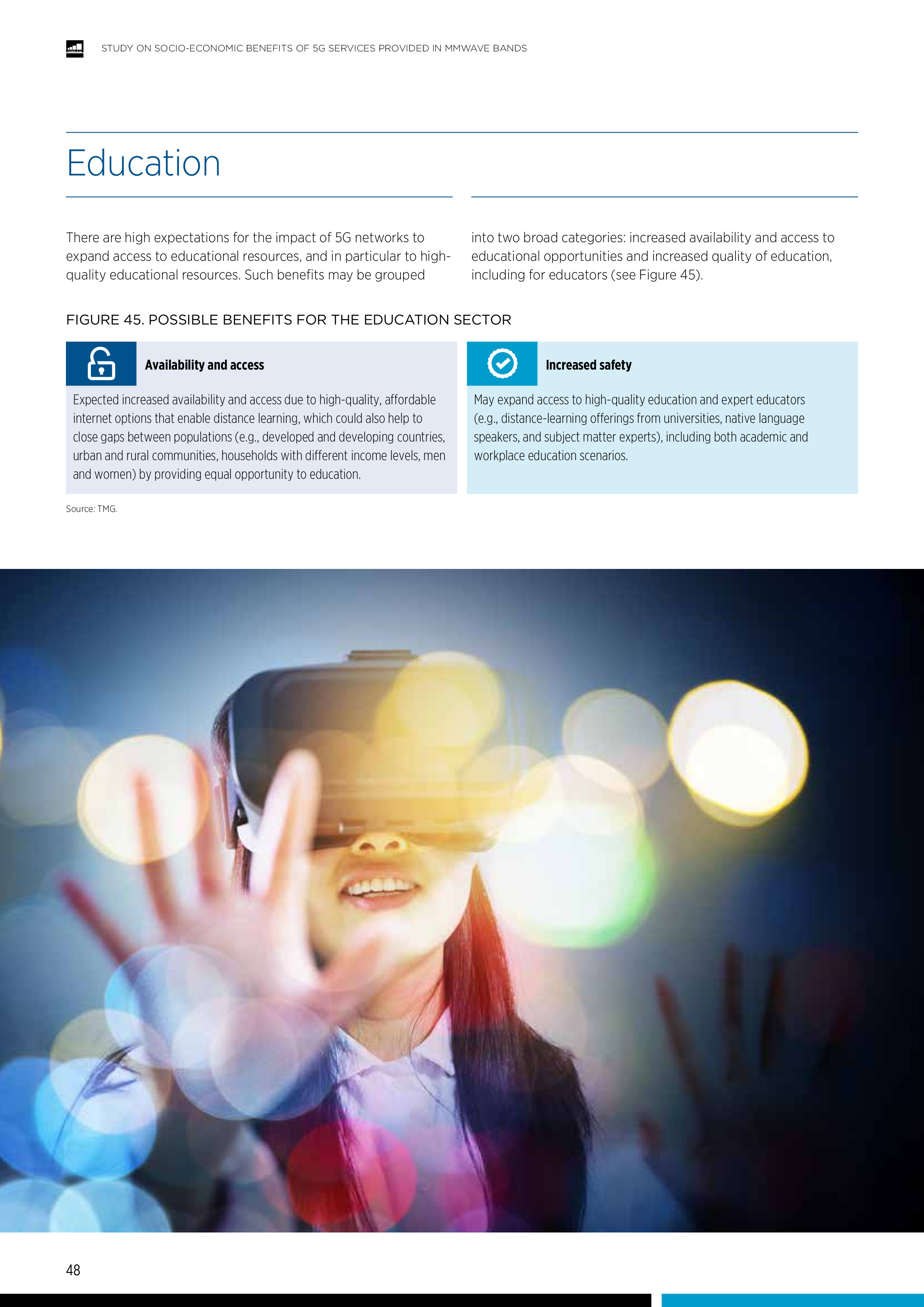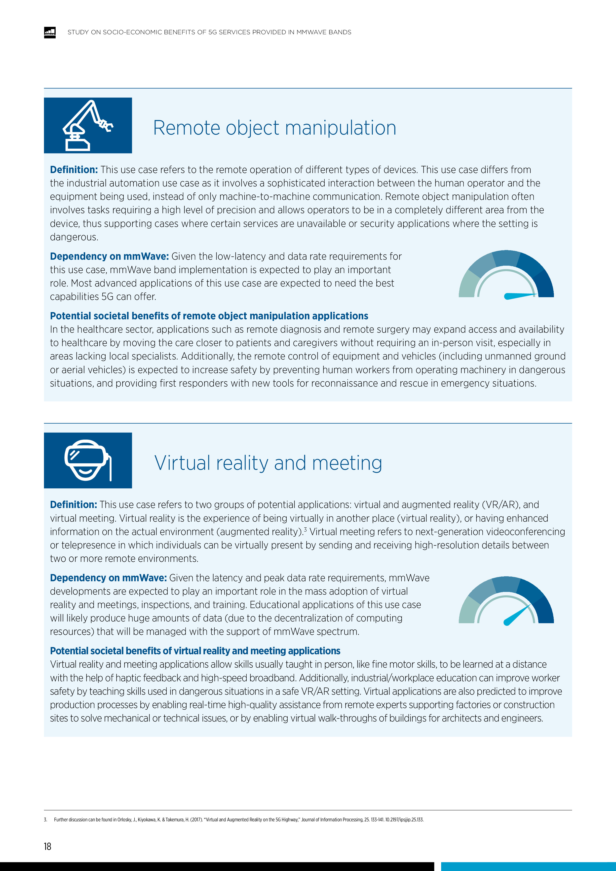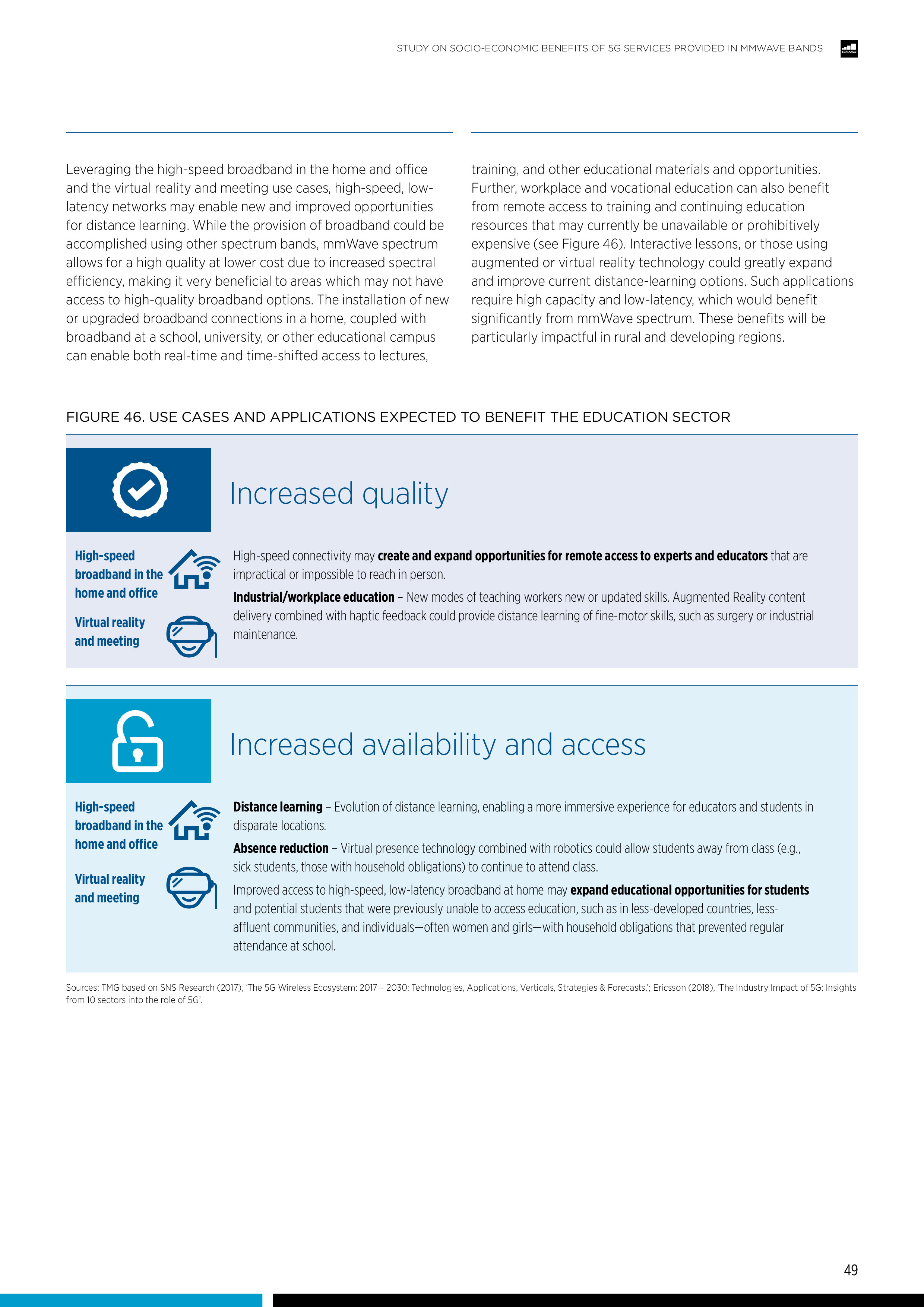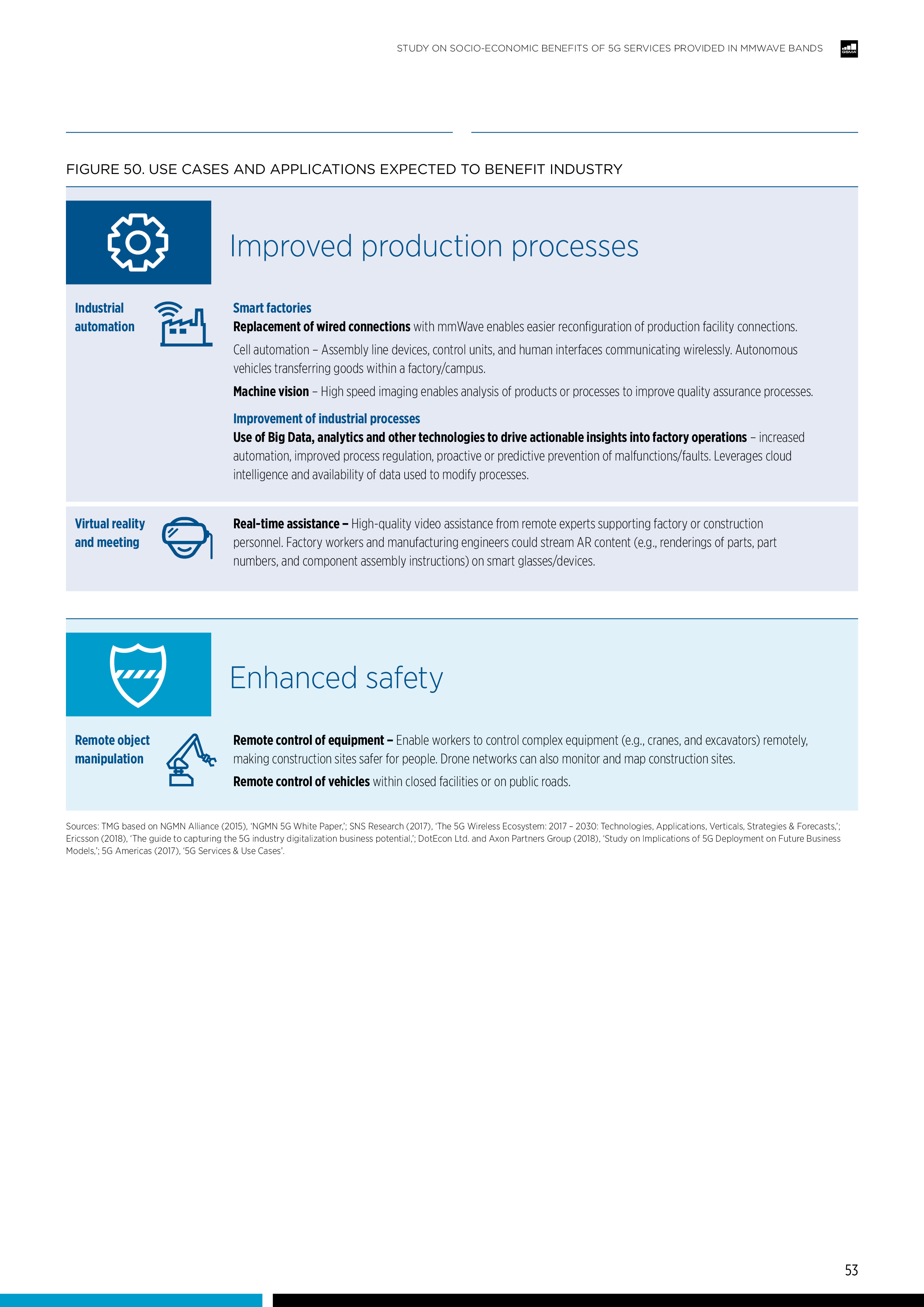 mmWave 5G不仅为消费者提供超快速的移动宽带服务,包括沉浸式娱乐,还将刺激大量应用研发,使消费者和企业能够实现现在无法做到的事情,包括改善远程医疗保健和教育、工业自动化、虚拟和增强现实等等。例如,在医疗保健领域,远程手术和“智能”仪器只有通过mmWave频谱才能实现并减少延迟。新一代机器人、远距离精确控制机器、无人机和数字化工业中心等其他实时控制应用也有望提高效率,降低成本,提高安全性,并带来产品和工艺的创新。