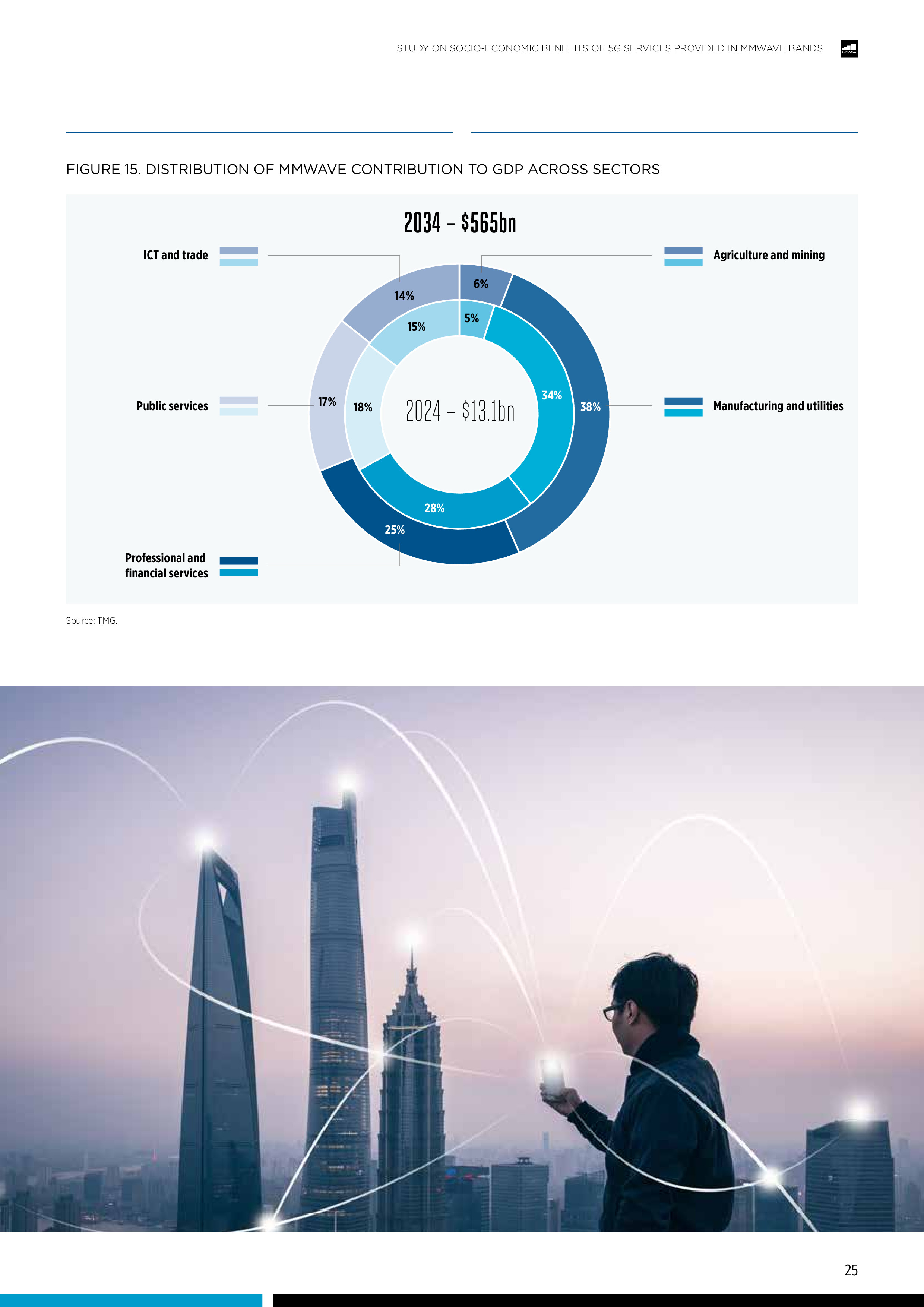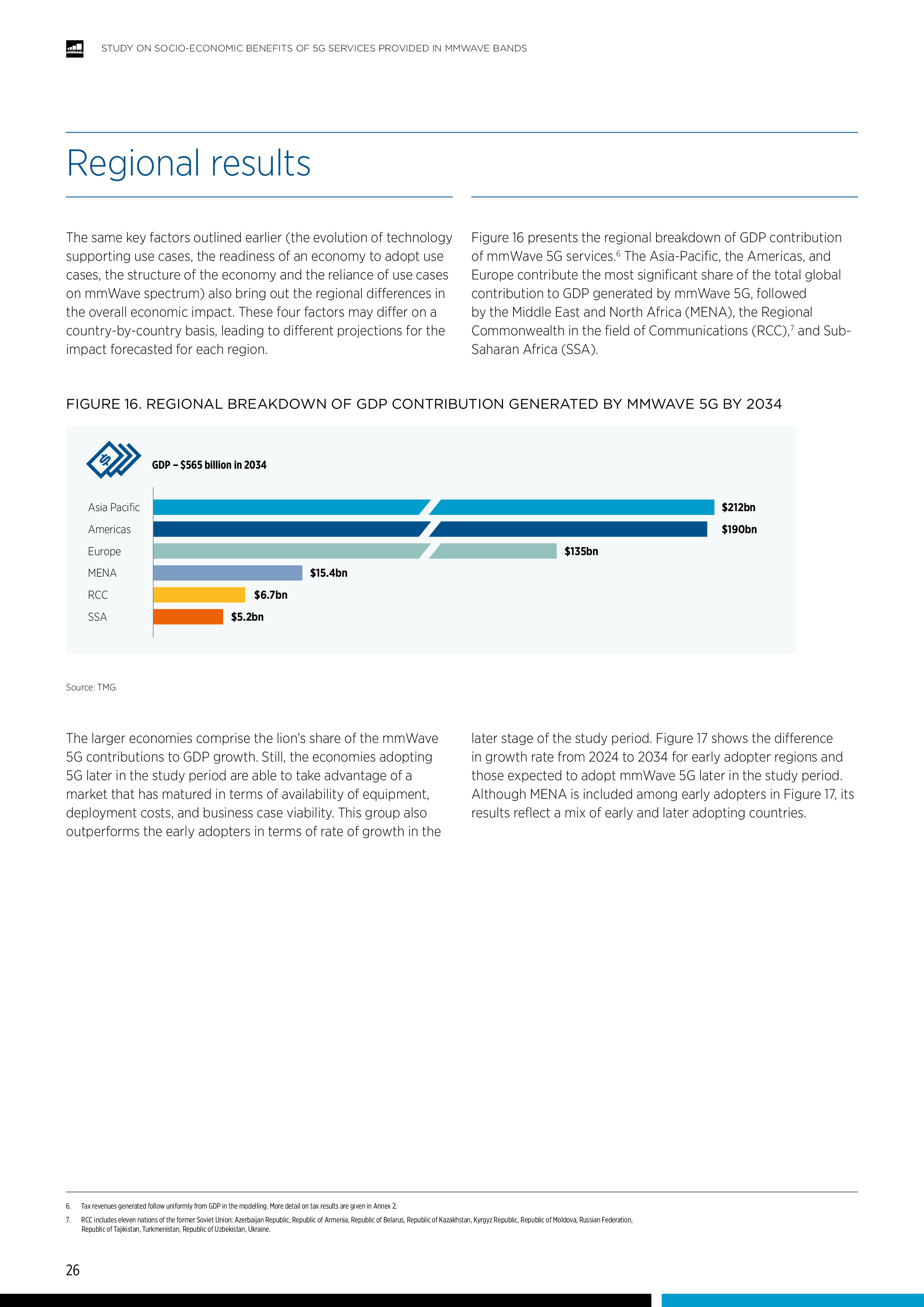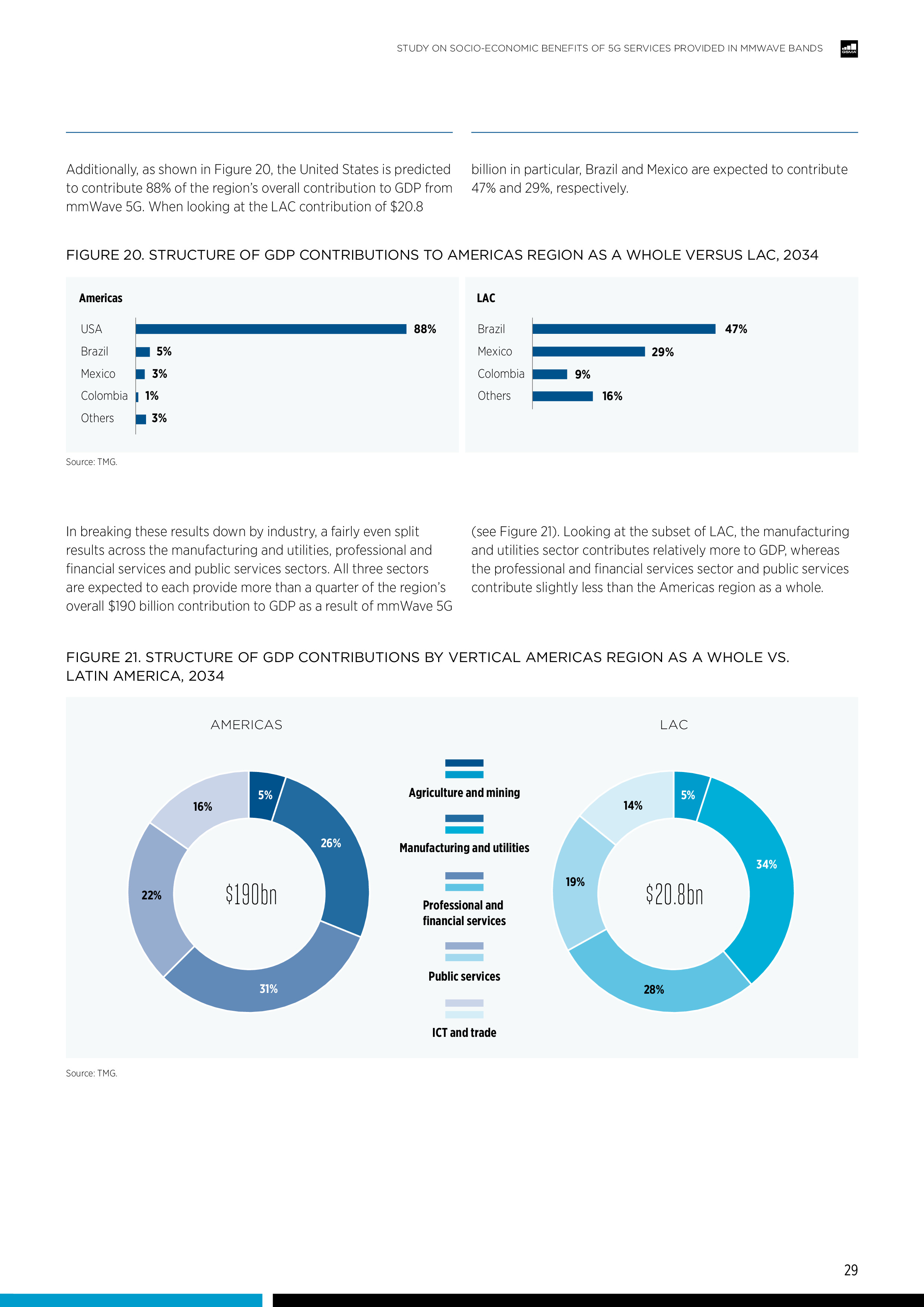 当然,优势并不仅限于早期采用,随着世界其他地区部署5G,可刺激经济更快地增长。例如,2026-2034年,撒哈拉以南非洲、中亚和拉丁美洲以及加勒比地区GDP增长中有超过65%是mmWave 5G贡献的。