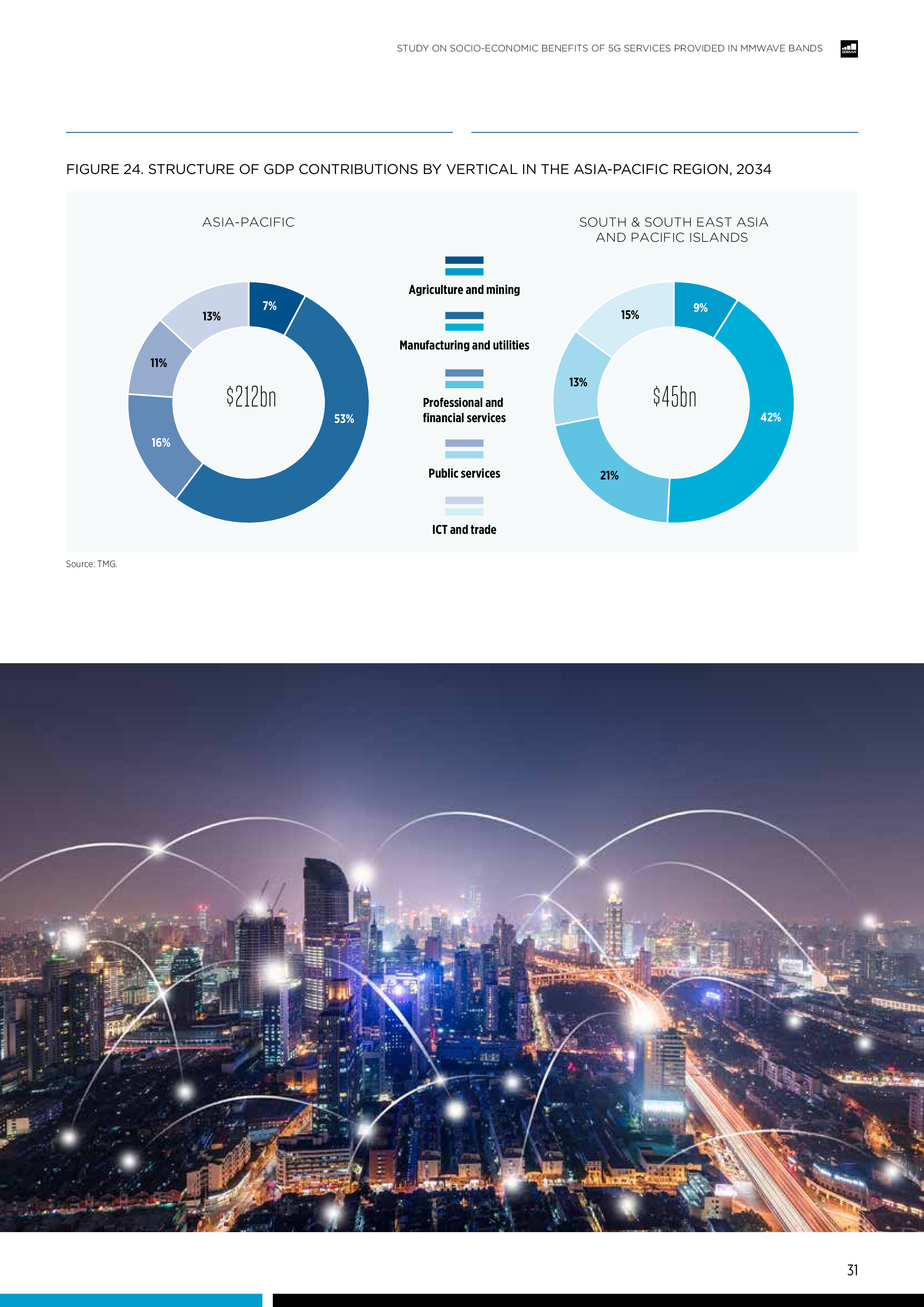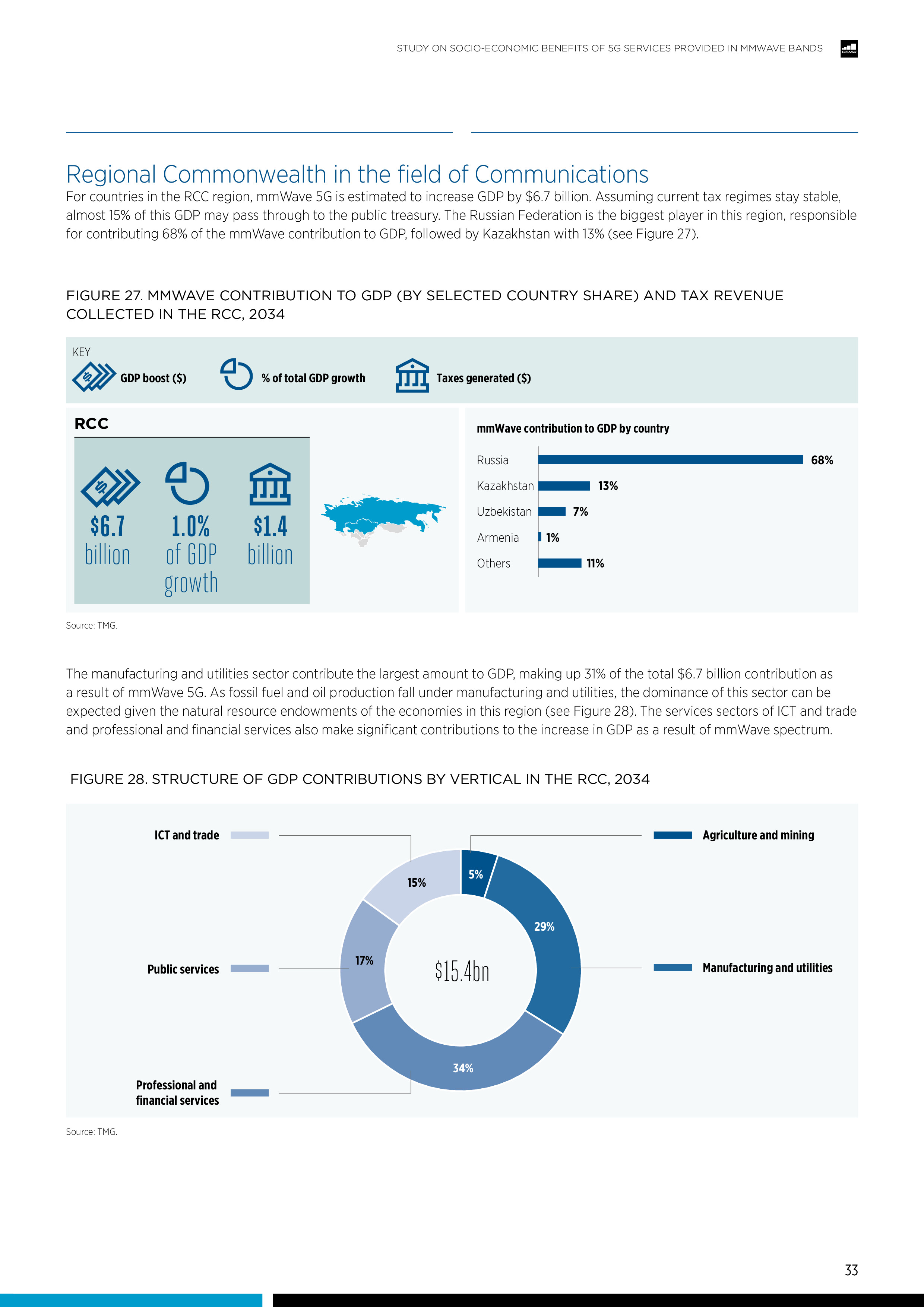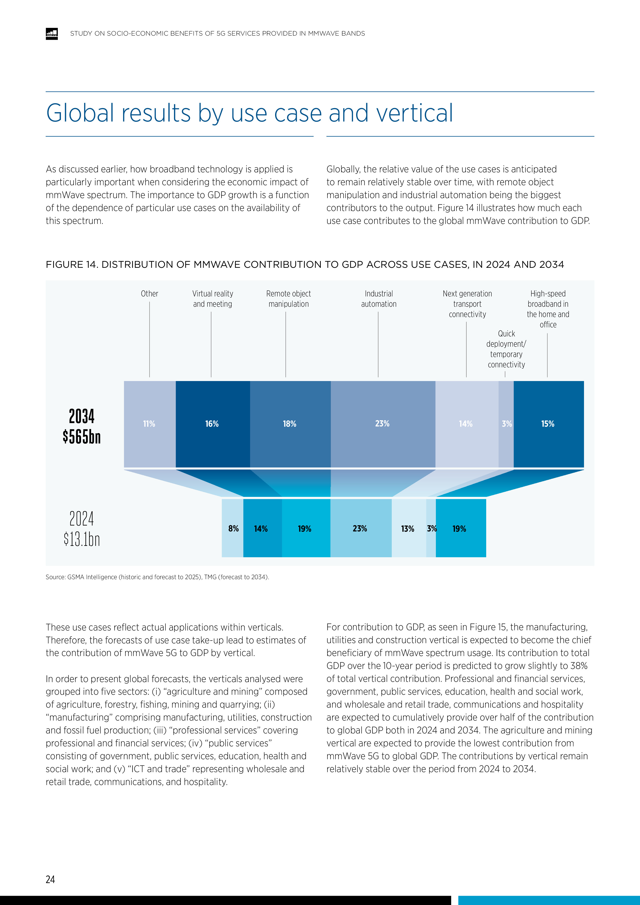 当然,优势并不仅限于早期采用,随着世界其他地区部署5G,可刺激经济更快地增长。例如,2026-2034年,撒哈拉以南非洲、中亚和拉丁美洲以及加勒比地区GDP增长中有超过65%是mmWave 5G贡献的。