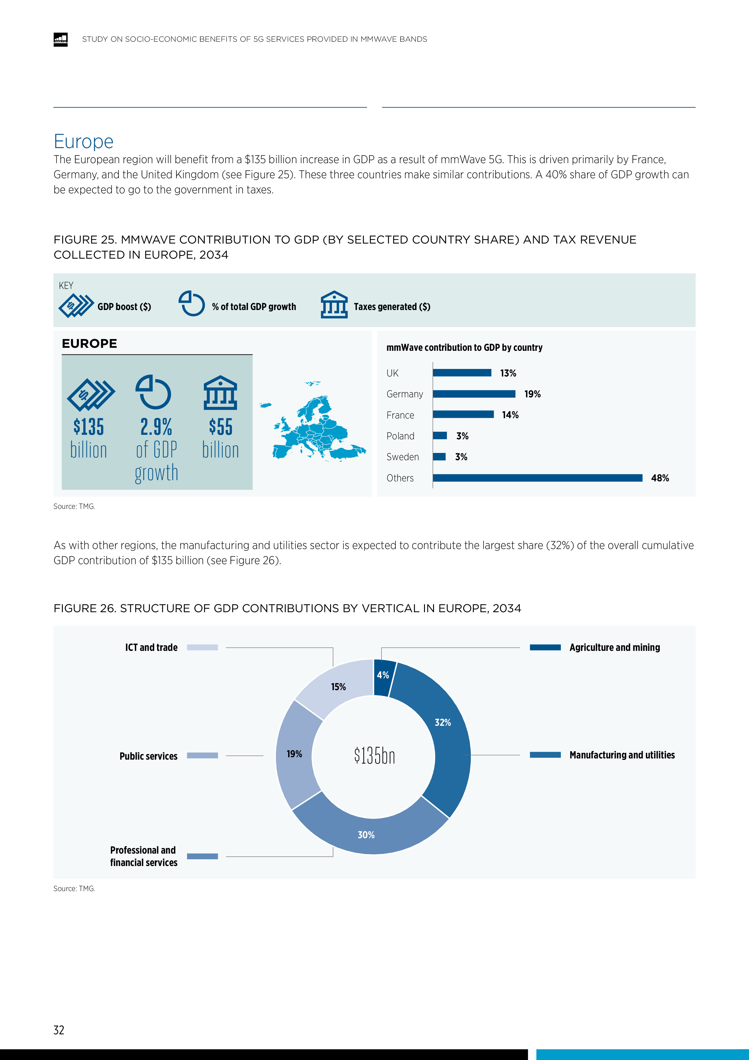 亚太地区和美洲已经在5G领域建立了领先地位,他们也将从mmWave的贡献中获得最大的利益,分别为GDP贡献2120亿和1900亿美元。mmWave对欧洲GDP增长的贡献最大(2.9%)。