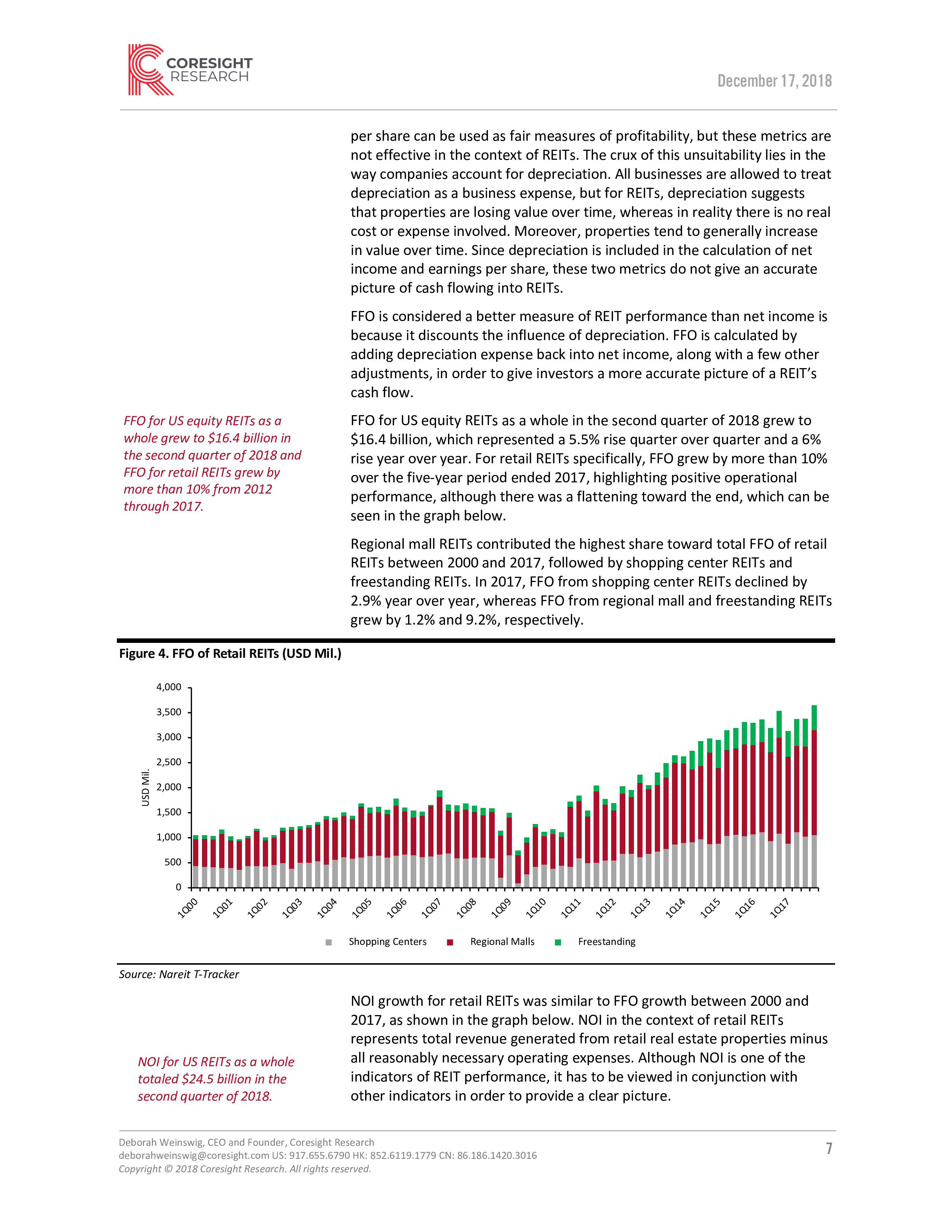 2018年第二季度美国REIT的FFO(Funds From Operations,营运现金流)增长至164亿美元,年增长6%。而零售REIT则增长了10%以上。