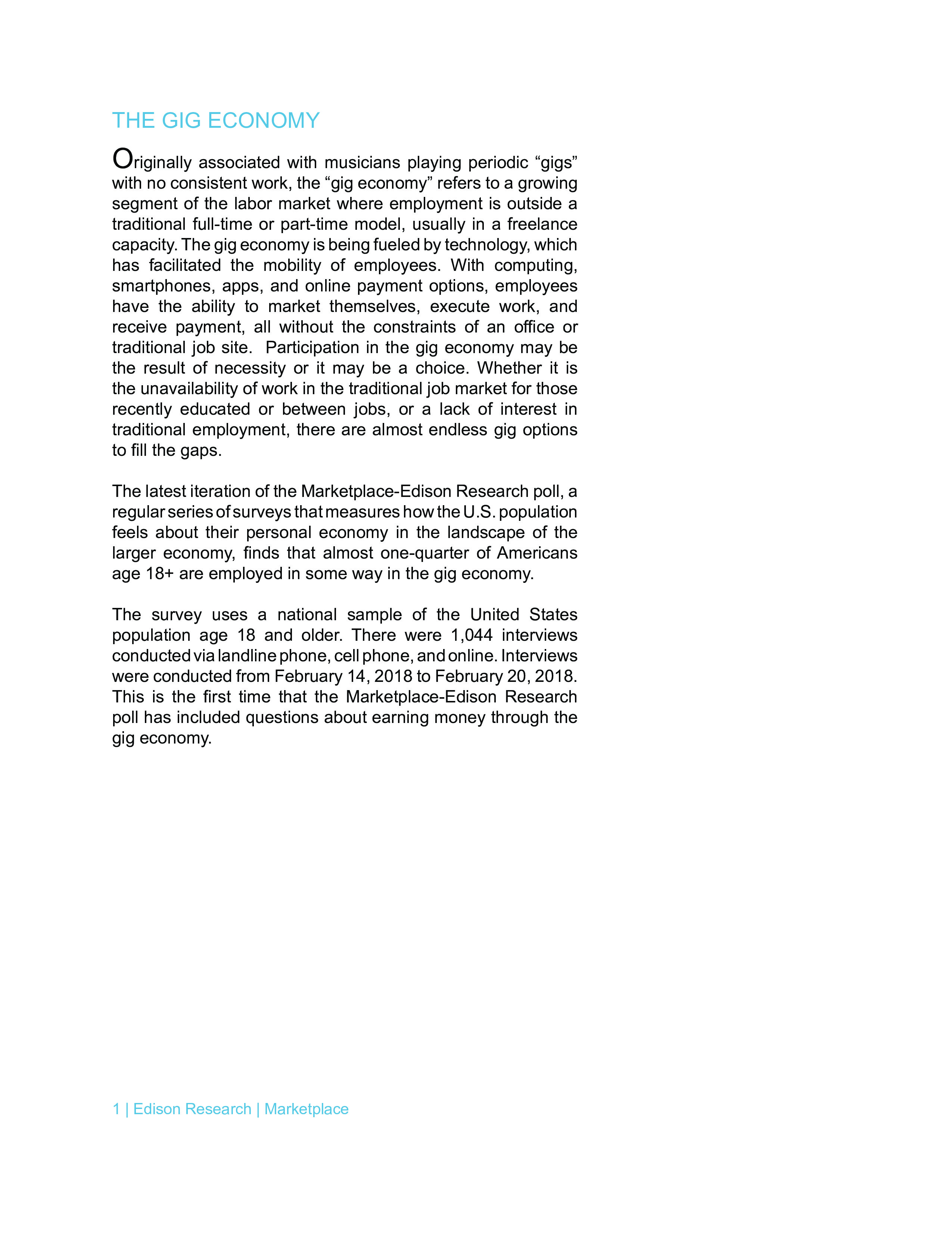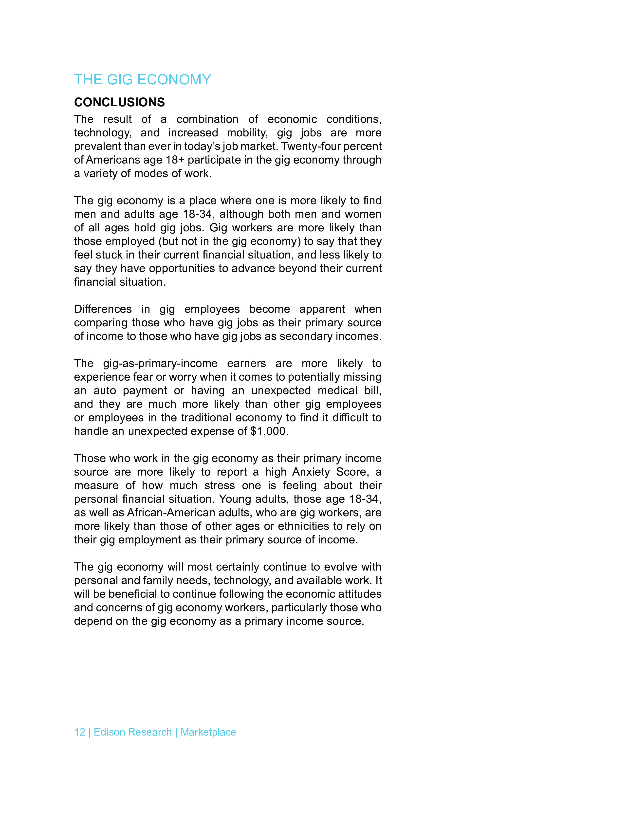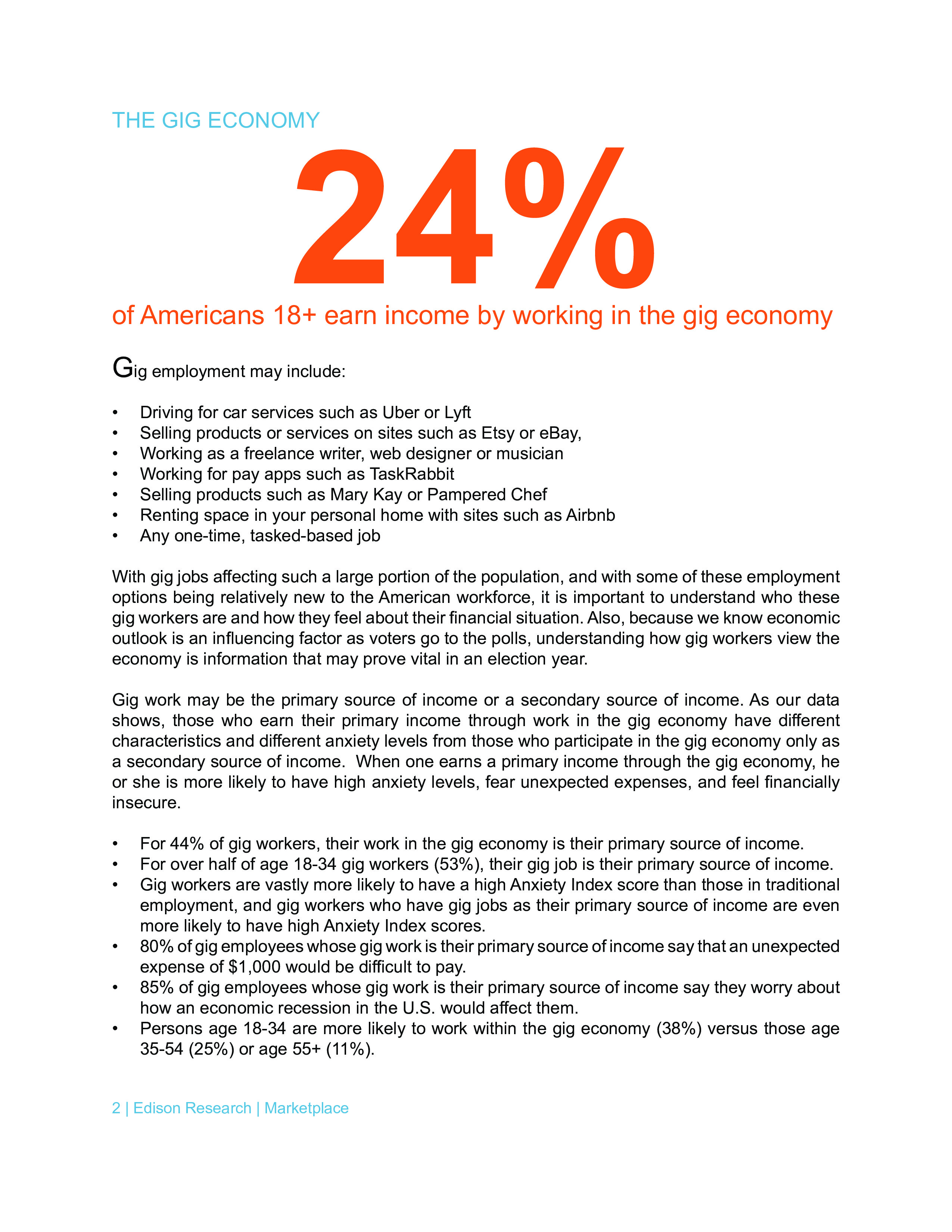 至少有24%的美国人至少从零工经济获得一些收入,例如优步或Lyft,在线销售产品或服务,或以某种类型的自由职业者身份工作。调查显示,零工经济正在成为主要或次要收入来源,那些依靠零工经济的人更可能焦虑、担心不可预知的支出,并感到经济上不安全。