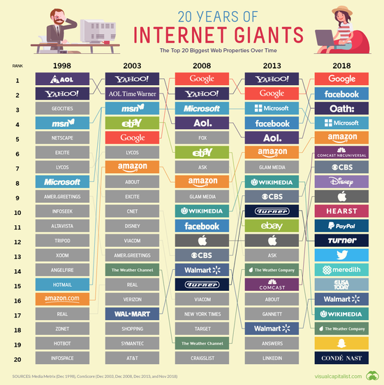 下面这张图展示了,从1998年到2018年,哪些互联网巨头登顶王座,哪些巨头却逐渐消亡,成为互联网的一个传说。
