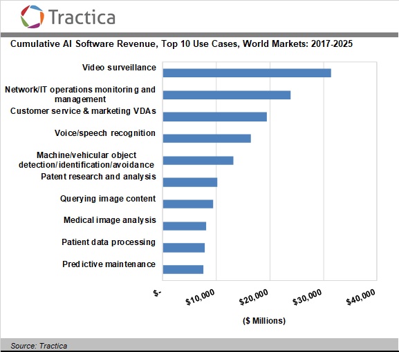 根据Tractica的最新调查,AI实施现在包含258个离散用例。截至2018年底,全球AI软件市场价值为81亿美元,预计到2025年将增长到1058亿美元。