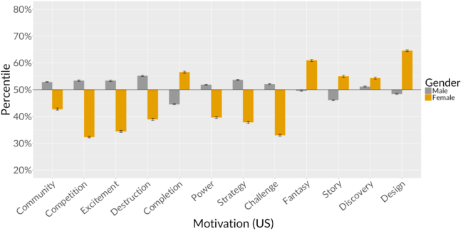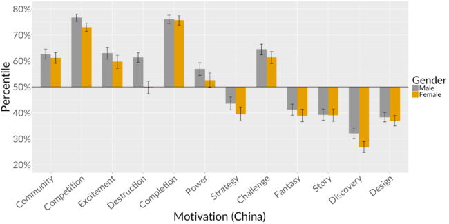 在西方男性游戏玩家更喜欢竞争、破坏和挑战类游戏,而女性游戏玩家更喜欢设计、幻想和完成类游戏。中国的男性游戏玩家更关心毁灭、发现和竞争。总体而言,唯一的区别在于中国的女性游戏玩家对枪支、爆炸和混乱的兴趣不如男性游戏玩家。