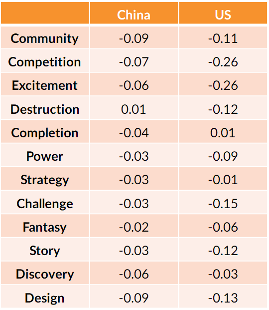 在QF的完整数据中,竞争和兴奋类游戏的吸引力随着年龄的增长而急剧下降。中国数据中没有1个相关性超过0.10。相比之下,美国数据中有7个系数超过0.10,其中2个系数超过0.25。即随着年龄的增长,竞争和兴奋的吸引力在美国玩家中迅速下降,而中国玩家则更为平静。