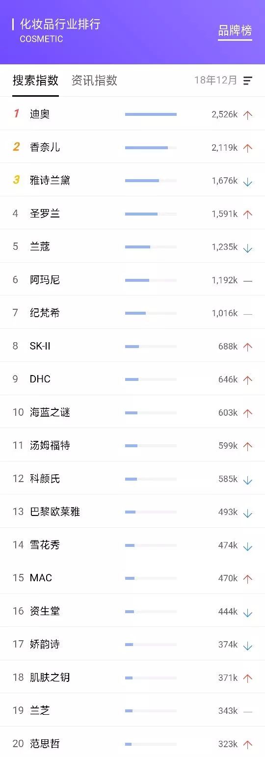 在12月的榜单中,迪奥位列第1名,香奈儿、雅诗兰黛、圣罗兰和兰蔻位列第2-第5名,第6-10名分别为阿玛尼、纪梵希、SK-II、DHC和海蓝之谜。与11月相比,迪奥和香奈儿超过雅诗兰黛来到前两名,科颜氏被海蓝之谜挤出前10名。