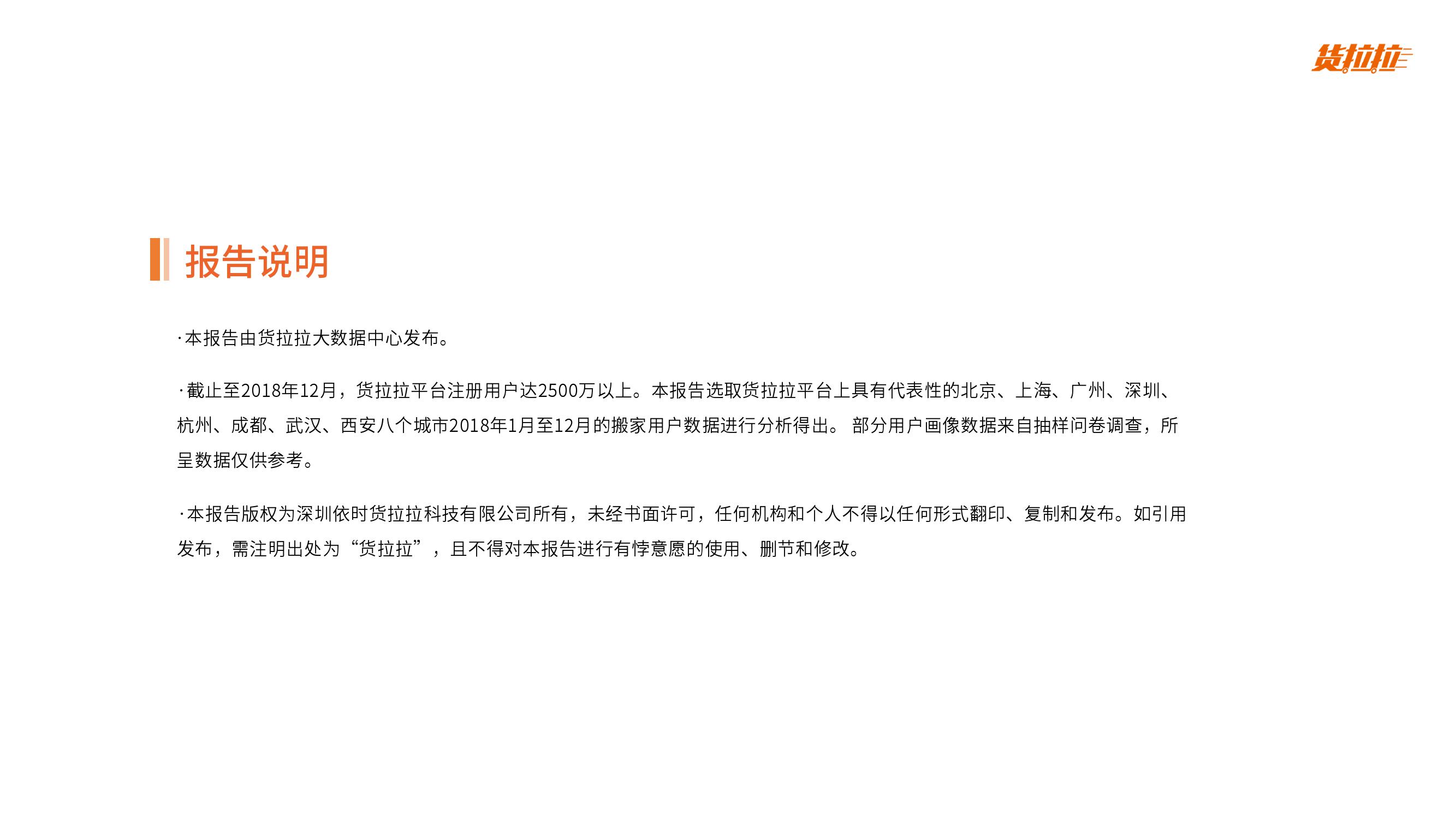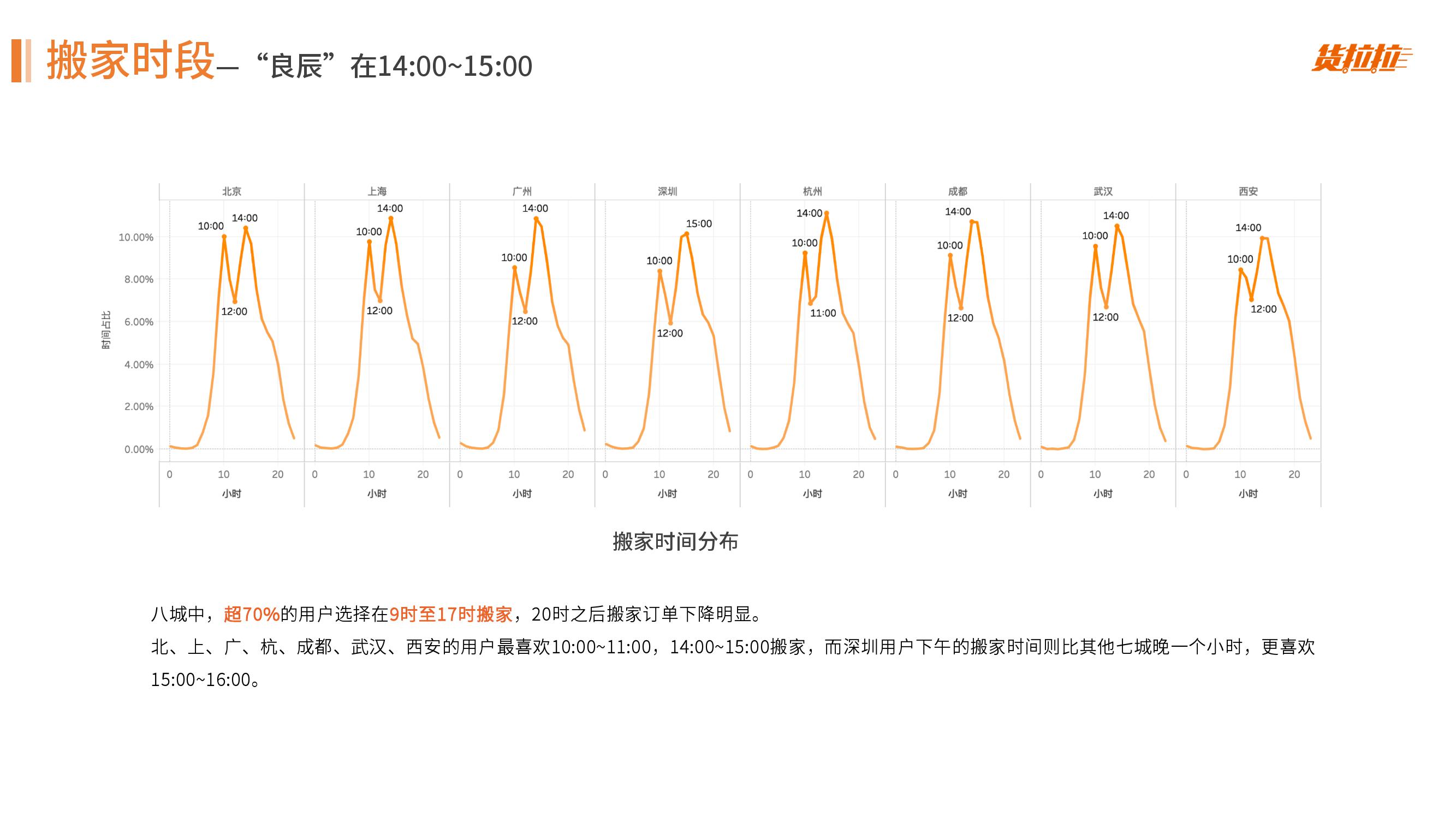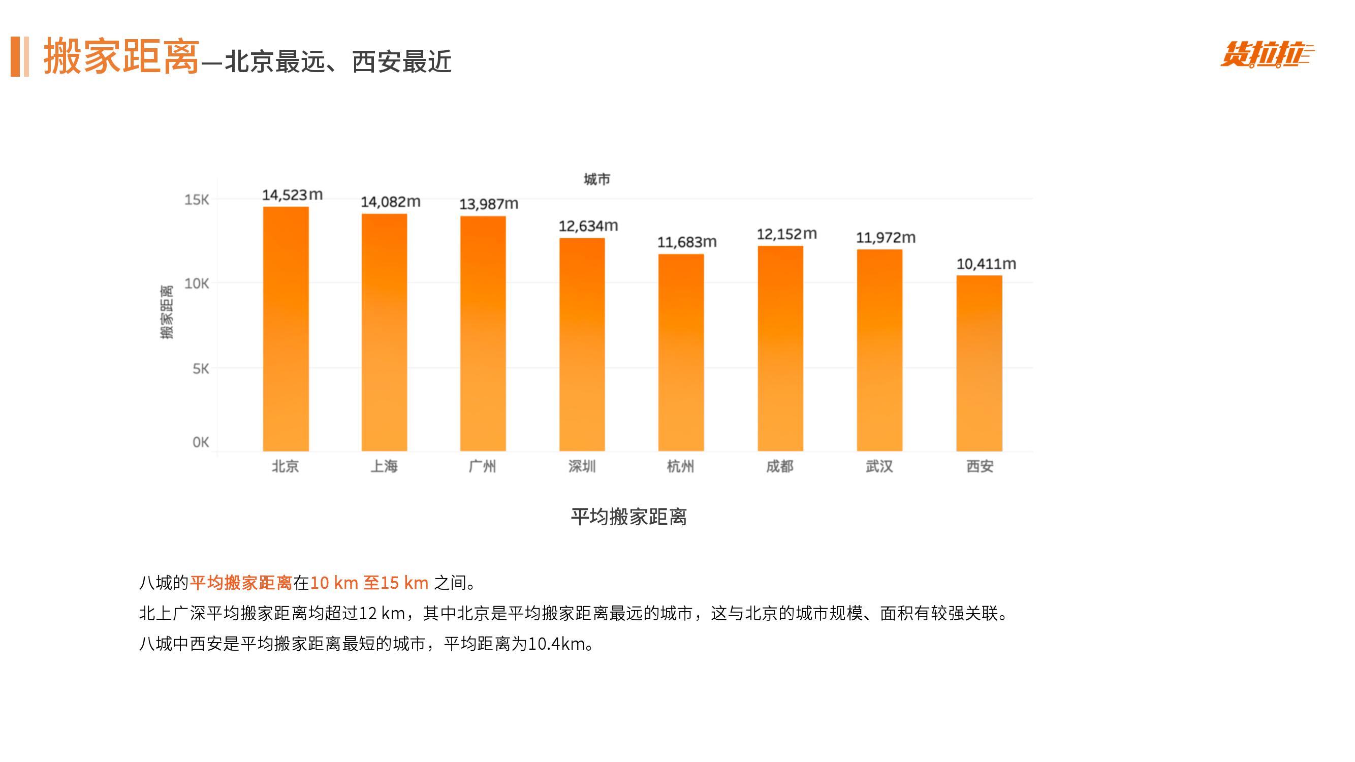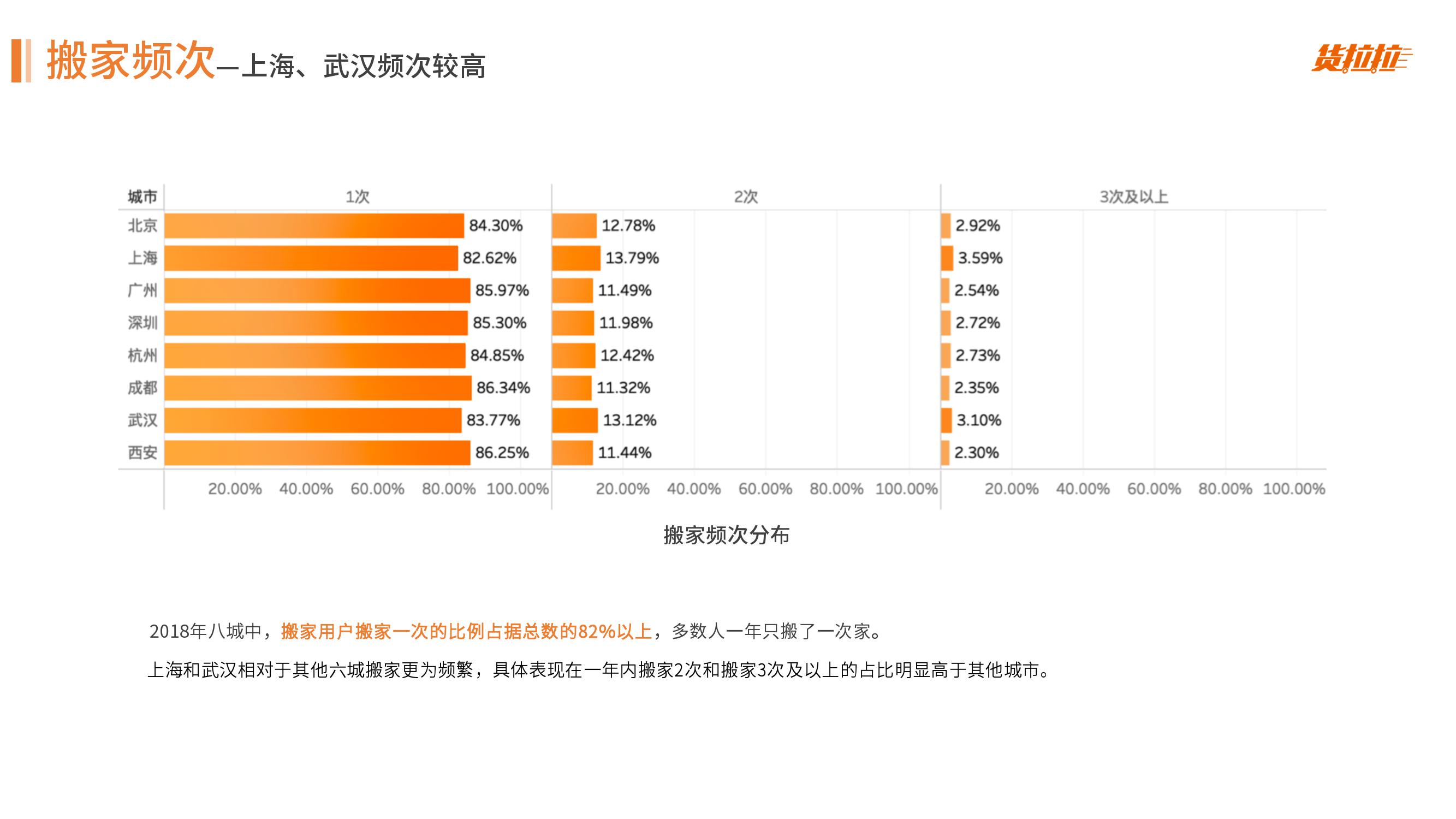 搬家已成为流动人口生活中必不可少的大动作之一。作为同城货运行业的头部企业,货拉拉发布了《2018年搬家大数据报告》,报告以北京、上海、广州、深圳、杭州、成都、武汉、西安8个城市的搬家数据为基准,展示了中国具有代表性的一、二线城市搬家趋势及分布规律。