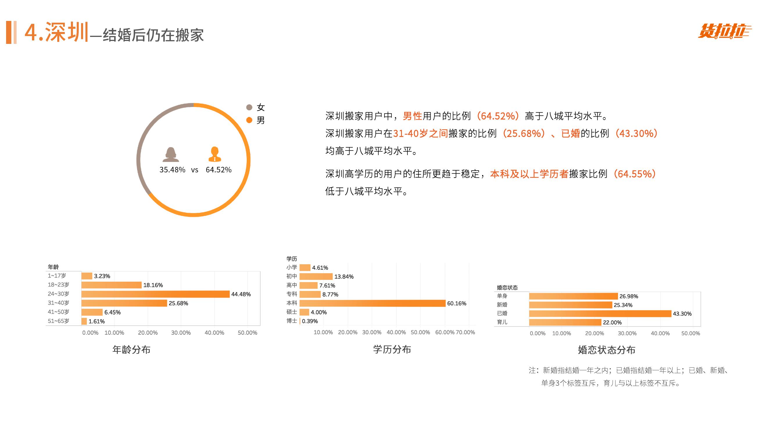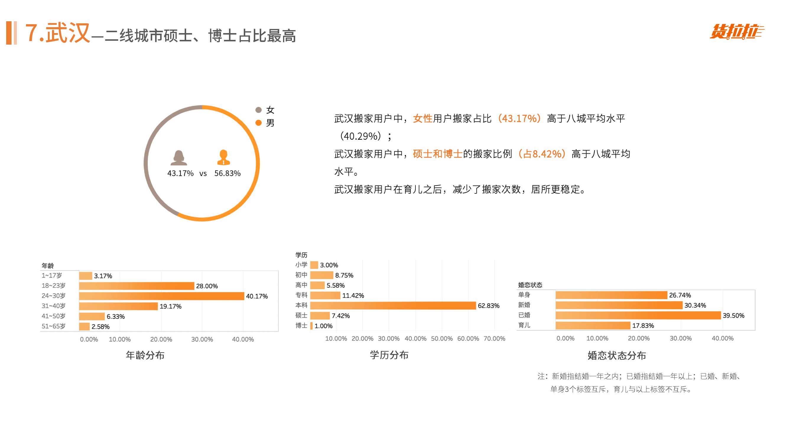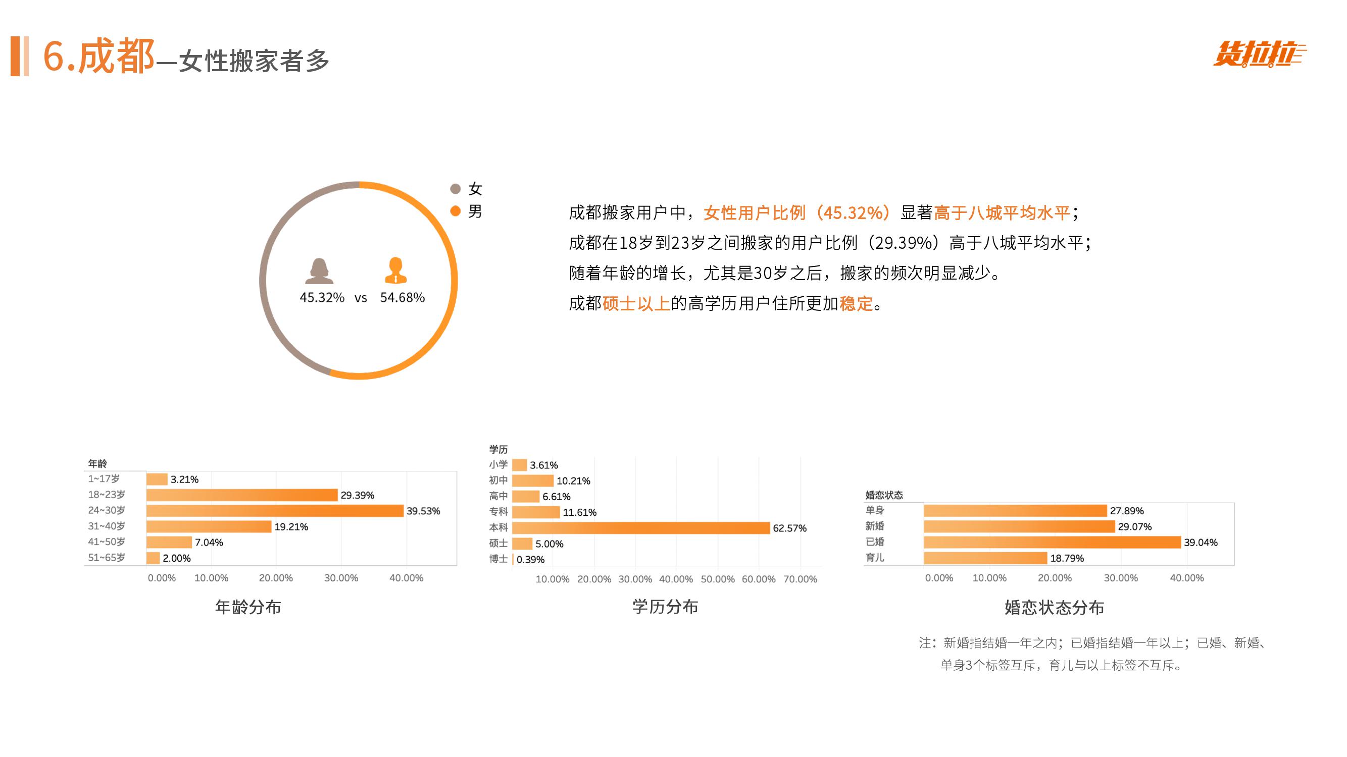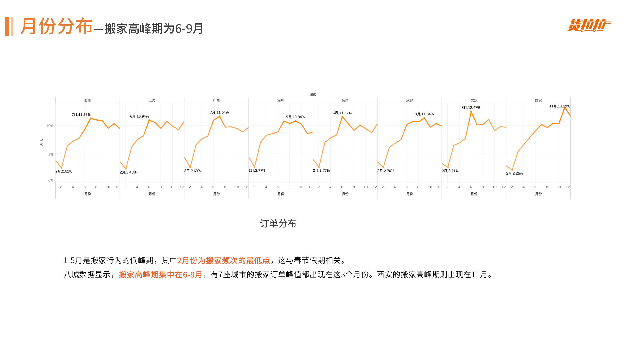 搬家已成为流动人口生活中必不可少的大动作之一。作为同城货运行业的头部企业,货拉拉发布了《2018年搬家大数据报告》,报告以北京、上海、广州、深圳、杭州、成都、武汉、西安8个城市的搬家数据为基准,展示了中国具有代表性的一、二线城市搬家趋势及分布规律。