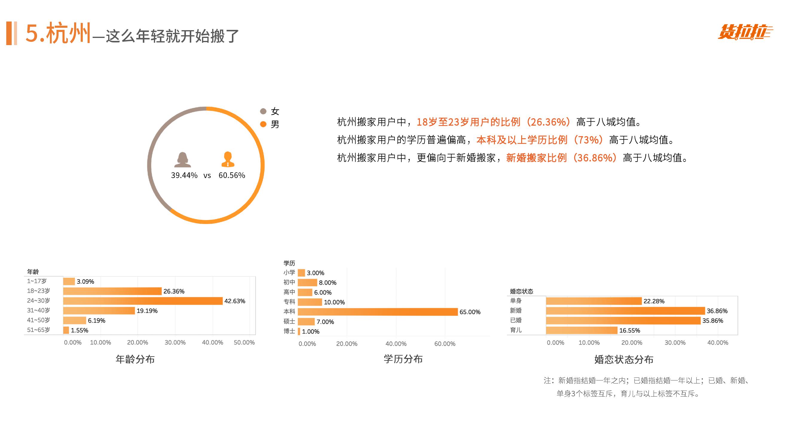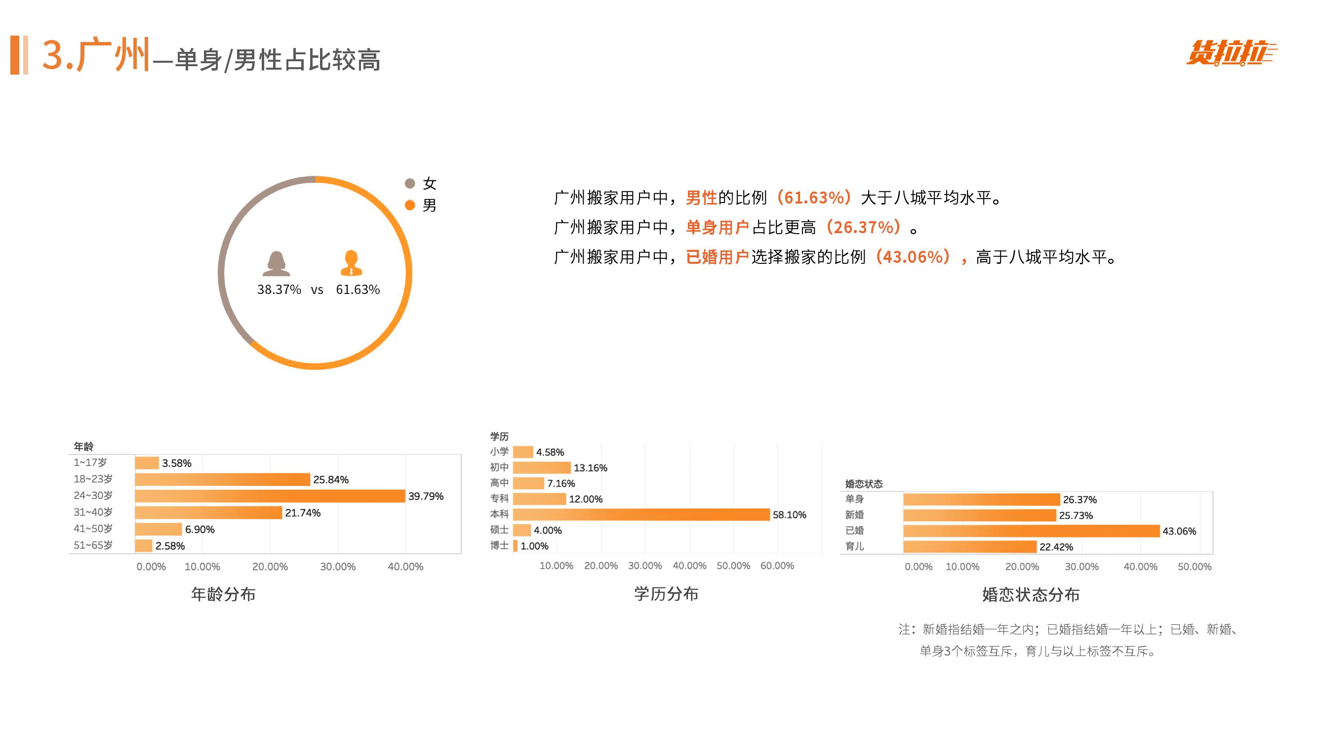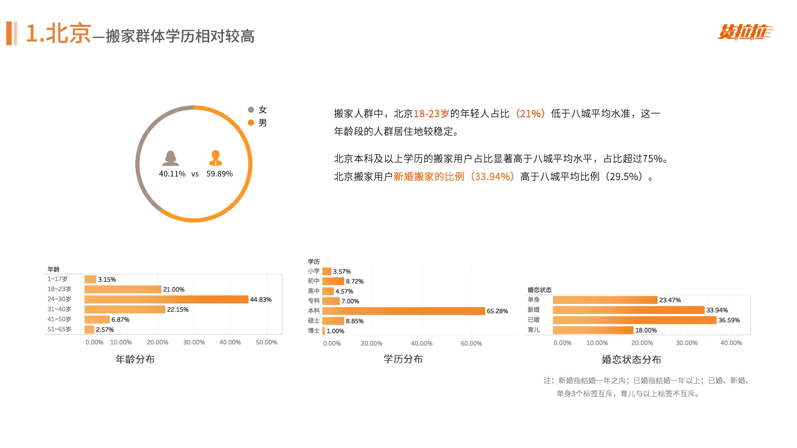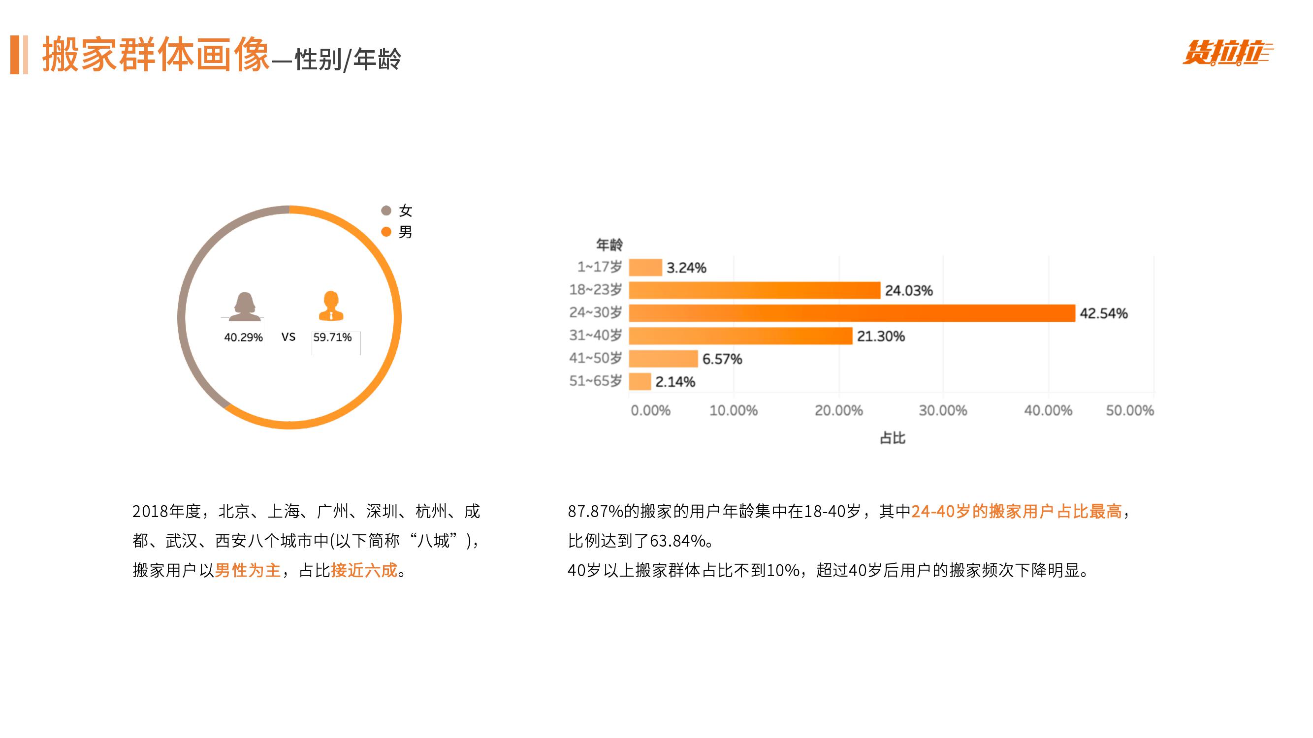 由于城市化进程加快、超大城市集聚效应增强、房价上涨等综合原因,主要一二线城市的搬家群体和频次都呈现逐渐增多的态势。数据显示,8个城市中,搬家用户以男性为主,占比接近六成。其中18岁至40岁为搬家高频用户,占搬家总人数比例的87.87%,24岁至30岁青年群体占比最高,达到了42.54%。40岁以上搬家群体占比不到总体10%,超过40岁后,用户的搬家频次呈明显下降趋势。