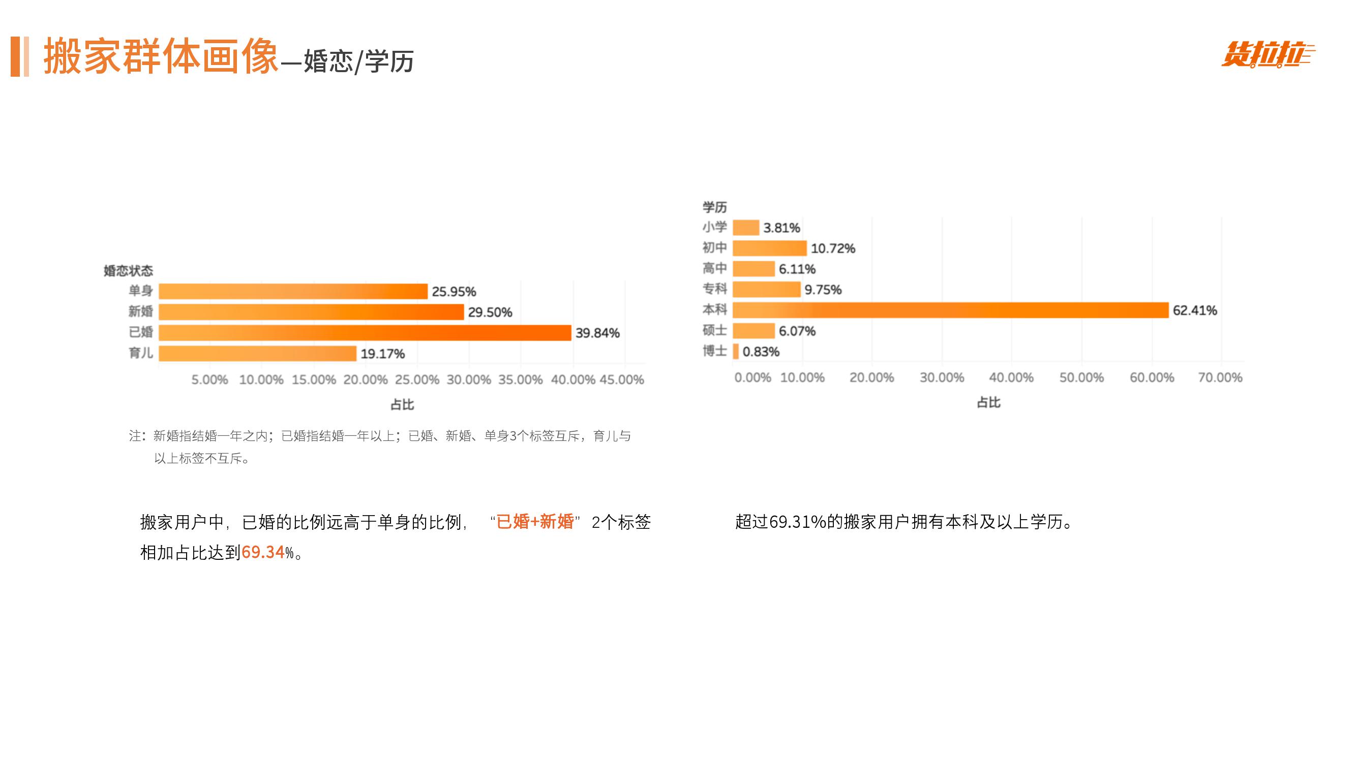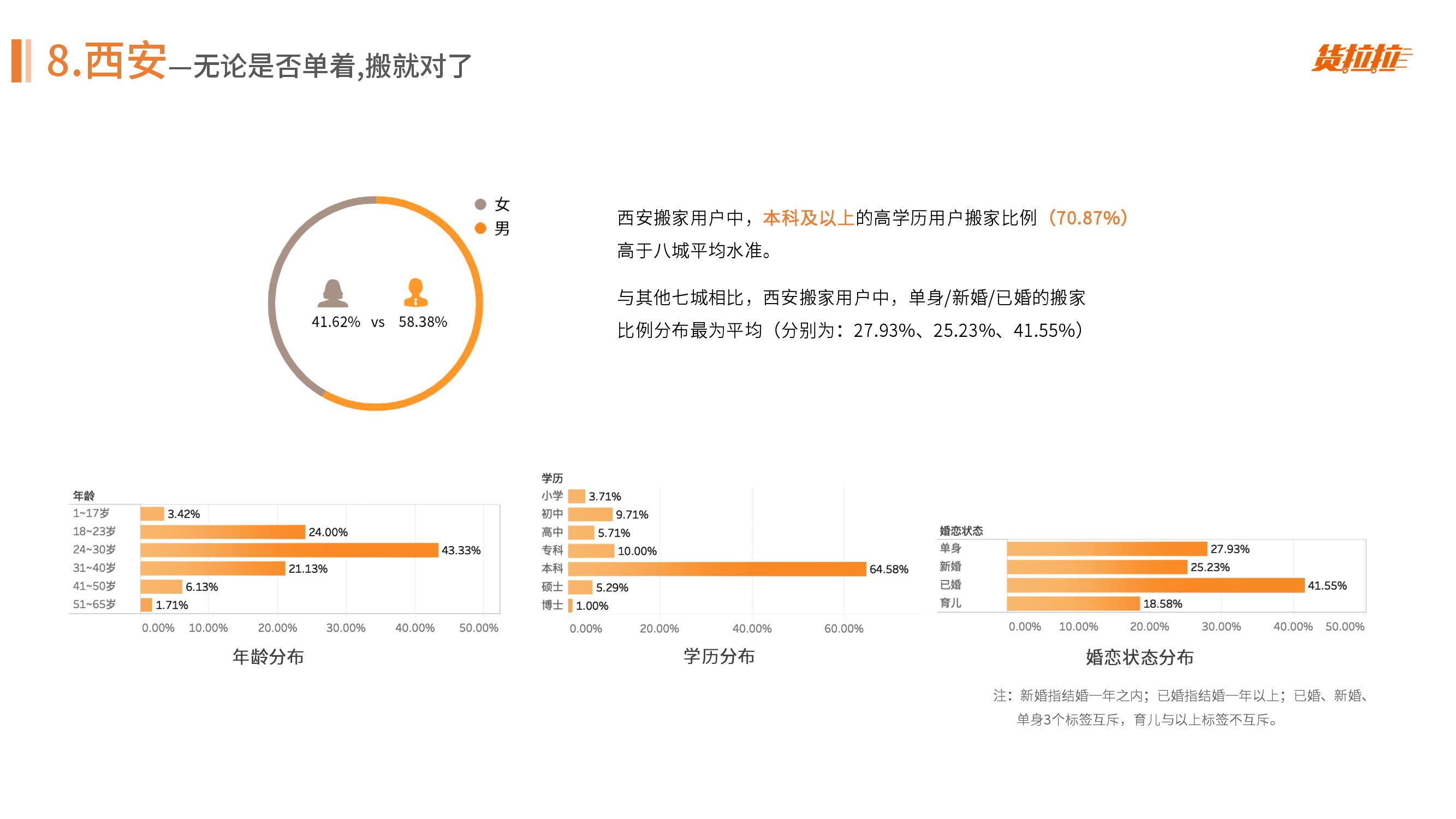 报告显示,西安搬家用户中,本科及以上的高学历用户搬家比例(70.87%)高于八城平均水平。与其他七城相比,西安搬家用户中,单身、新婚、已婚的搬家比例分布最为平均,分别为:27.93%、25.23%、41.55%。数据还显示,高新区的搬家订单频次最高,尤其是唐延路沿线,该区域企业和公司相对比较集中,因而搬家流动相对频繁。西安搬家最集中区域是2018年拆迁的最大城中村——鱼化寨。鱼化寨已于2018年11月份完成搬迁,故2018年搬家频次较为频繁。