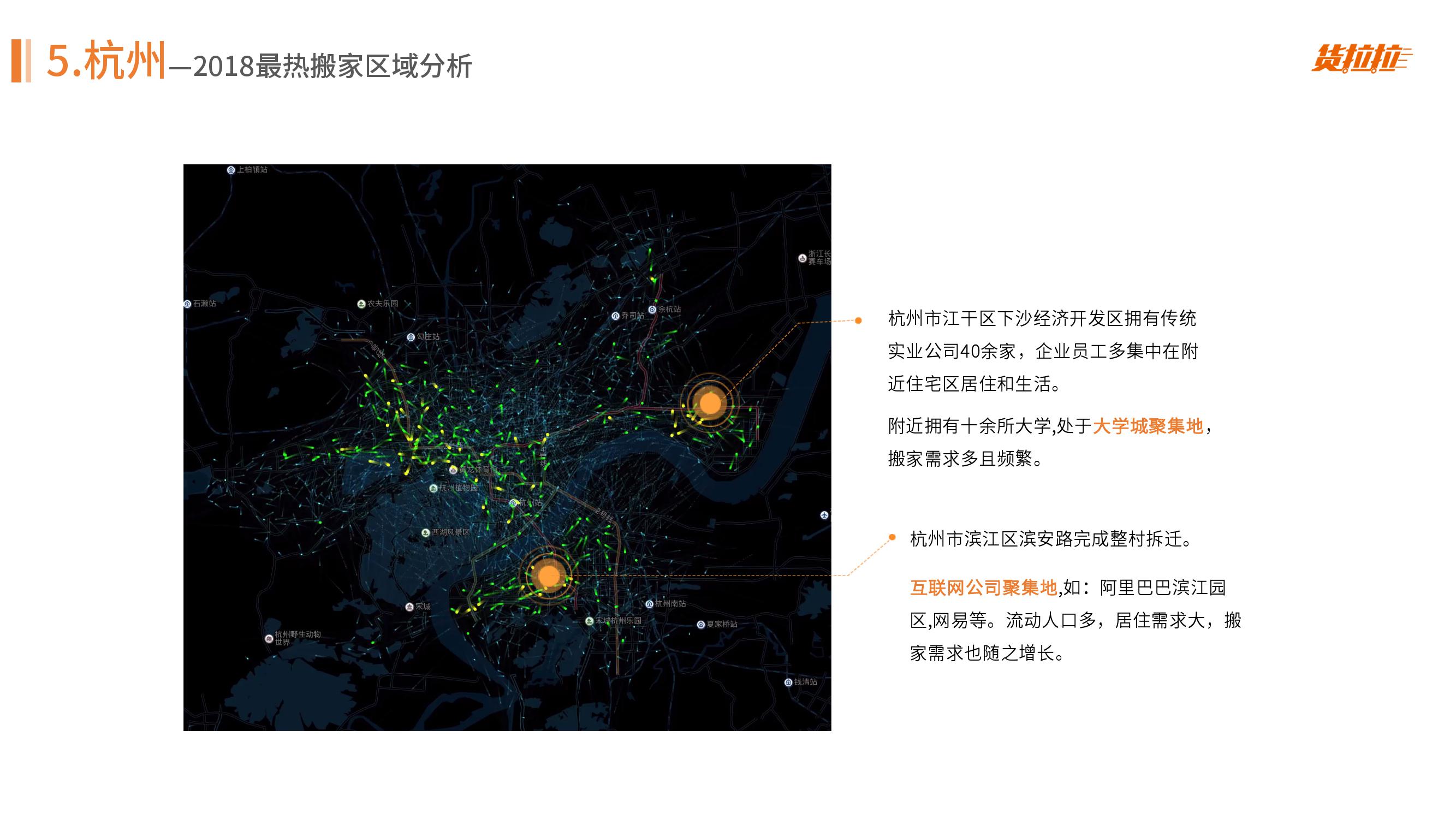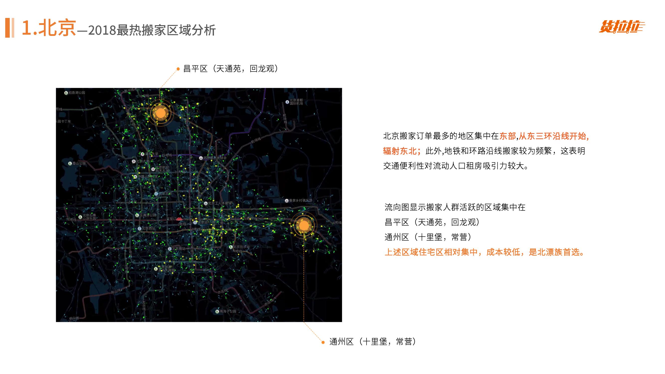 大数据显示,搬家人群对目的地最看重的是交通便利程度与房租水平。从时间分布上来看,“毕业季”“求职季”所在的6月至9月,也成为最热搬家季。从地域分布上看,一二线城市的搬家用户分布集中于CBD商区附近和地铁沿线,用户对于出行和工作的便利性有着更高的要求。而随着城市转型和改造,引进的高新互联网公司带动周边经济和发展,或将带来一批迁入热潮。