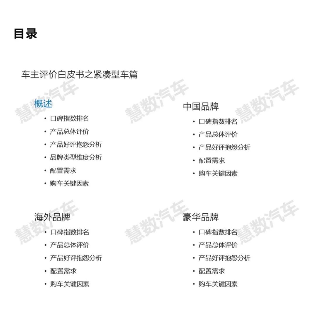白皮书所用数据均来自汽车之家、易车、爱卡等垂直汽车网站口碑频道认证车主的文字点评信息,每篇口碑的字数平均在500-2000字,从小型SUV、紧凑型SUV、中大型SUV、小型车、紧凑型车、中型车、MPV、新能源车8大类别分析,覆盖中国品牌、海外品牌、豪华品牌,全面解读各类车型的真实用户评价数据。