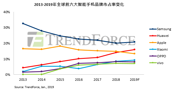 2019年三星的目标仍旧为守住既有版图并积极开拓新兴市场。由于过往遭受中国品牌厂规格战的夹杀,其今年将在规格及定价上采取更为积极的策略迎战中国品牌。集邦咨询预估,三星今年仍将为全球市占第一、市占率约20%。