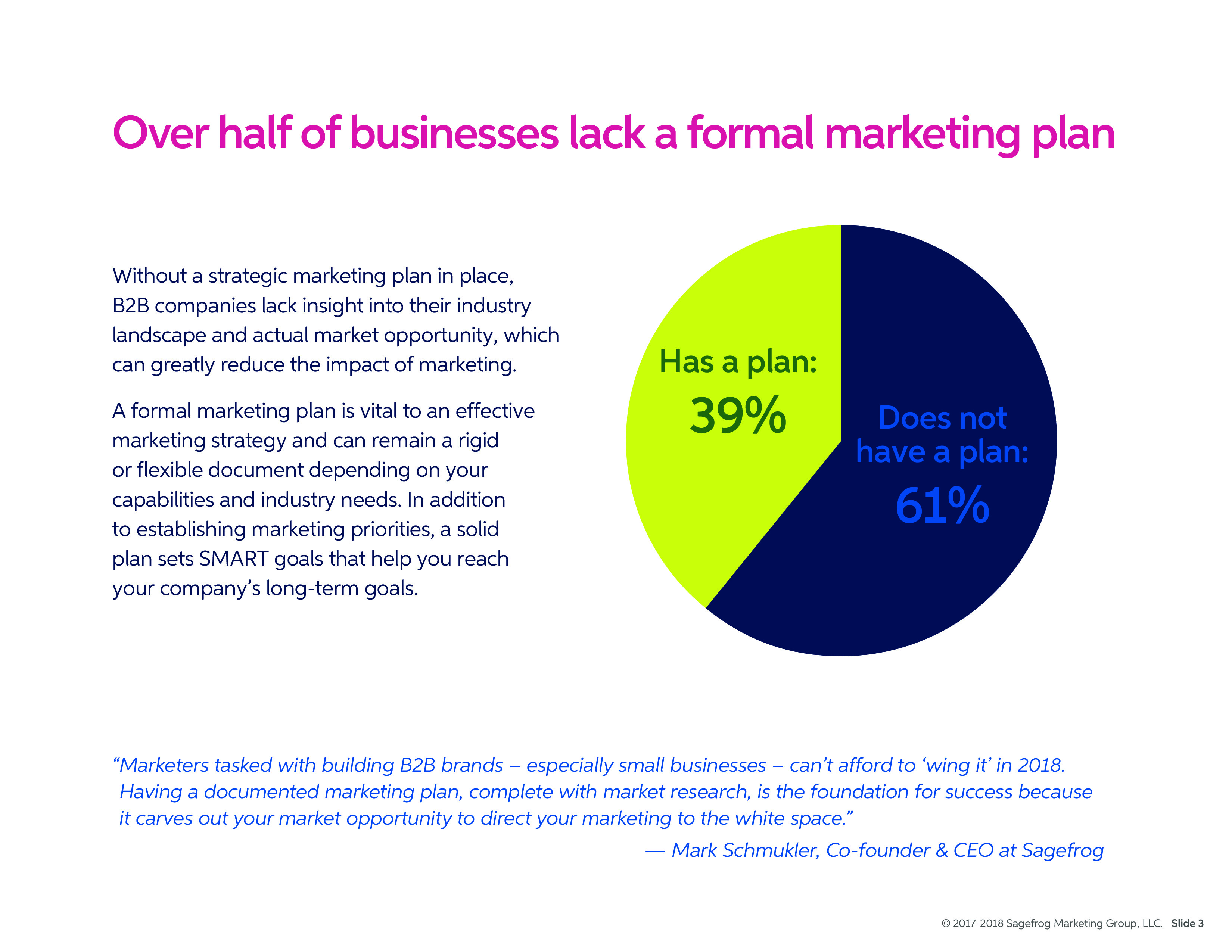 B2B公司缺少对行业格局和市场机会的洞察力,这会大大降低营销的效果。正式的营销计划至关重要,企业可以根据自身的能力和行业需求创建固定或灵活的计划。
