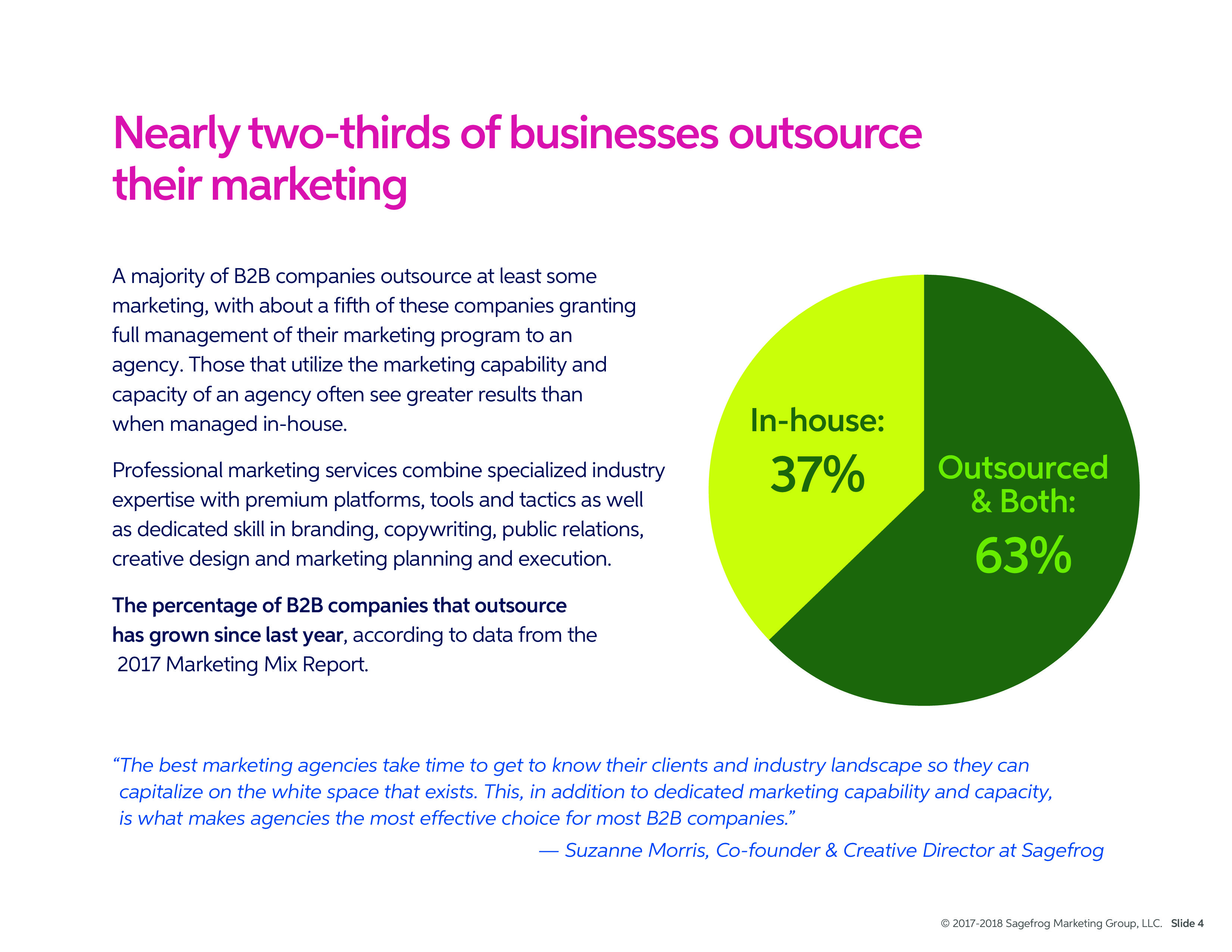 只有1/5的企业完全利用内部资源管理其营销工作。外包则能整合专业的营销服务和知识,优质的平台、工具和策略。自去年以来,外包营销工作的企业数量在增长。