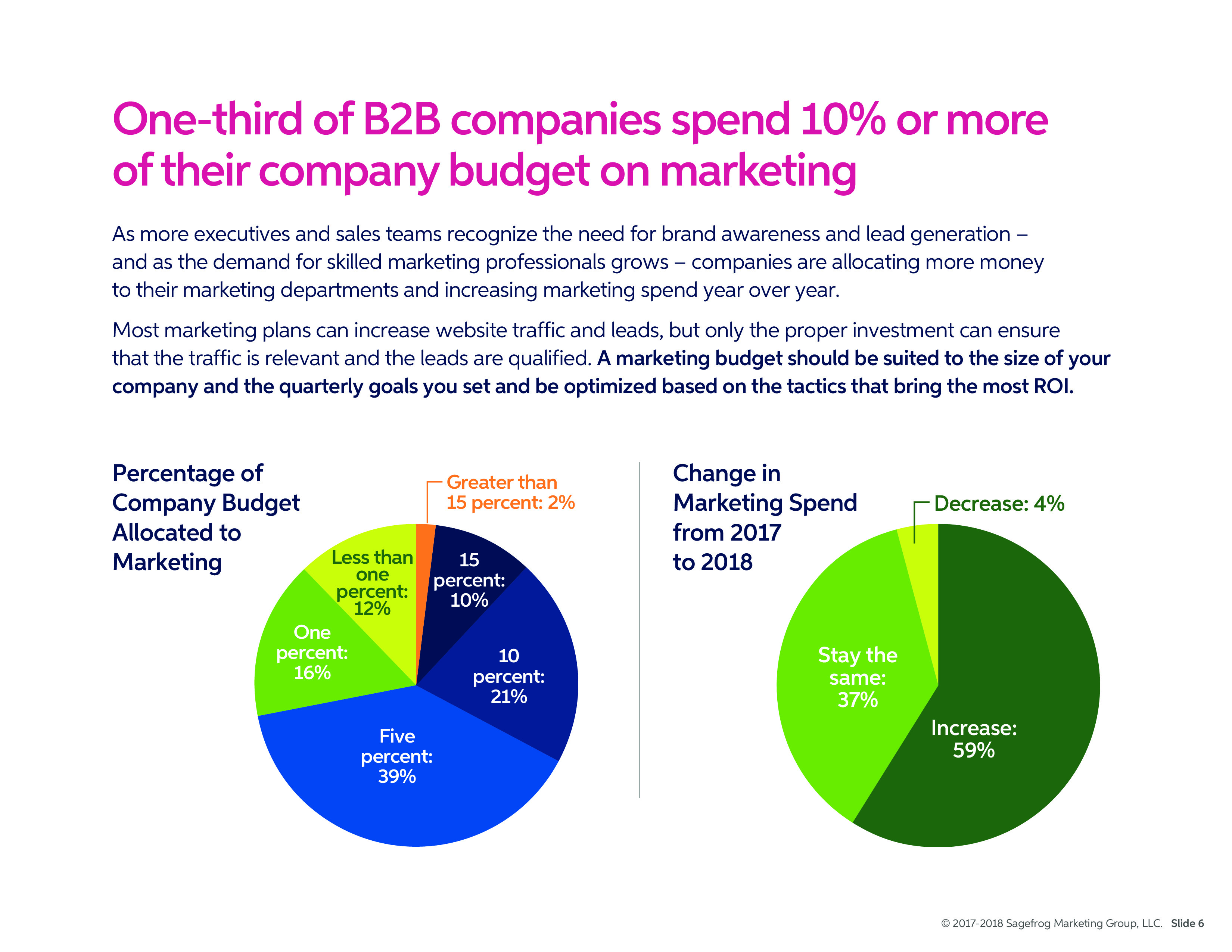 随着越来越多的高管和销售团队认识到品牌意识和潜在客户的需求,公司正在给营销部门分配更多的预算,营销预算逐年增长。但是,营销预算应该适合公司的规模和季度目标,并根据带来最高投资回报的策略进行优化。