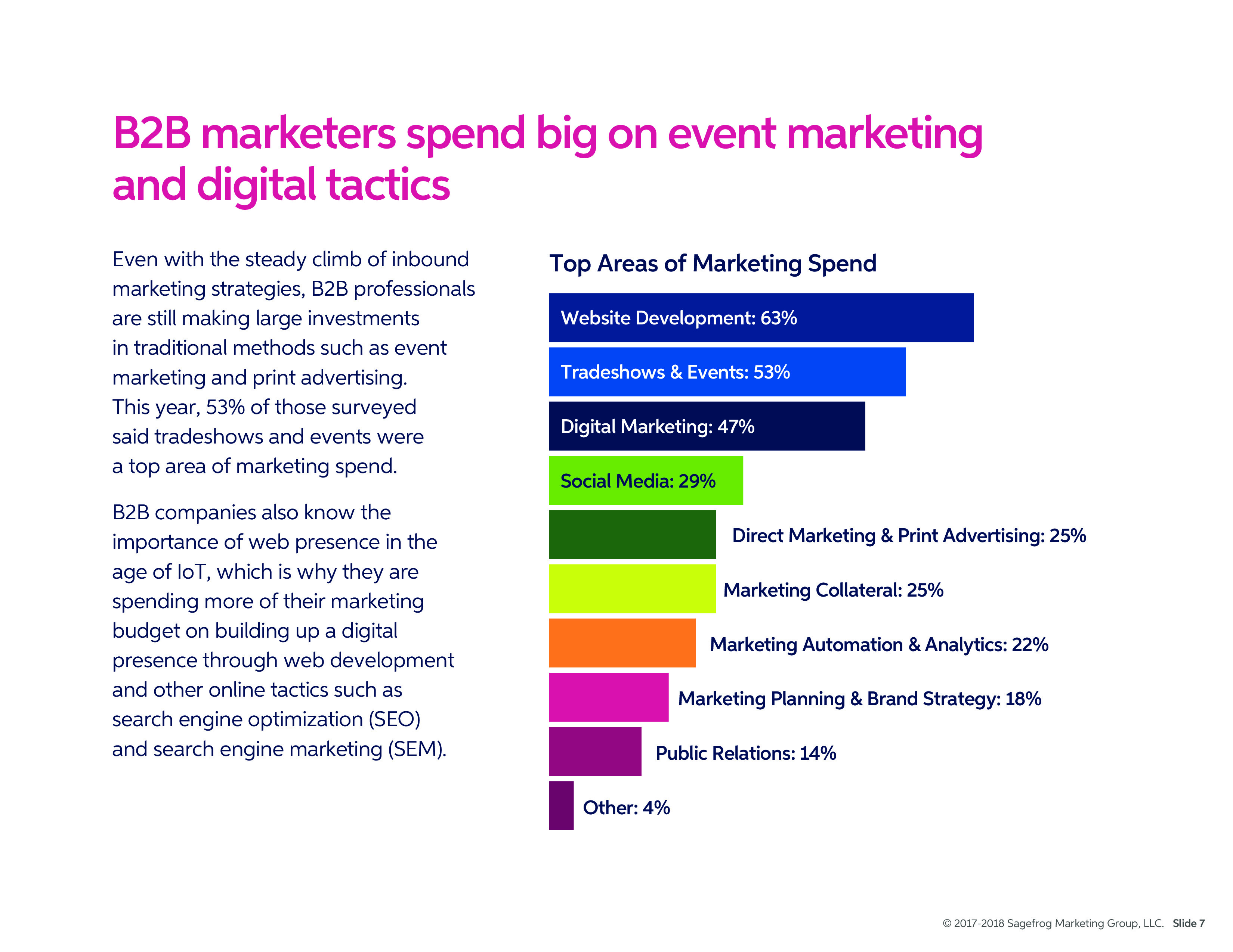 53%的受访者表示贸易展和活动是营销支出的最大领域。当然,B2B公司也知道网络的重要性,因此也在投资网络开发和在线营销策略。