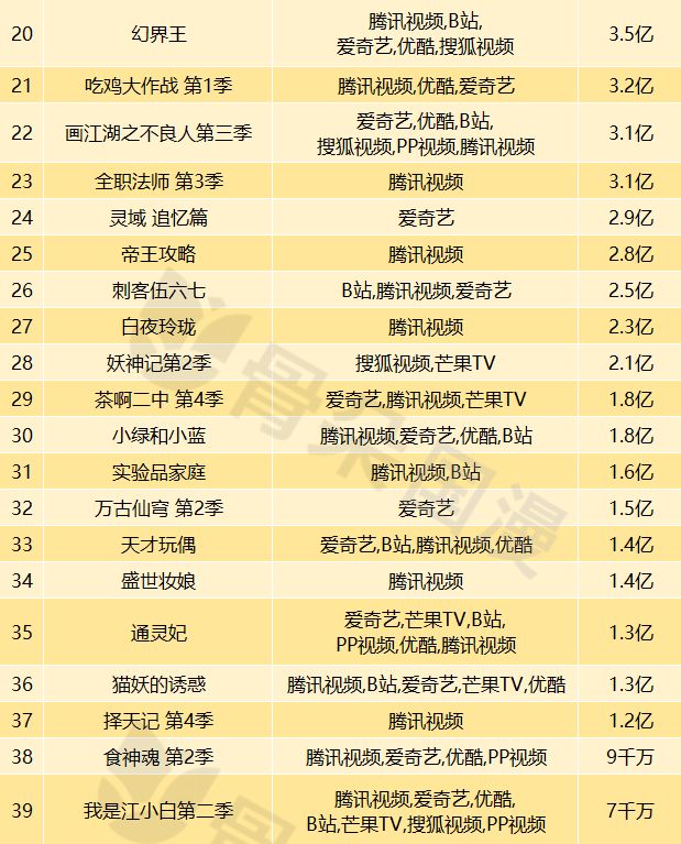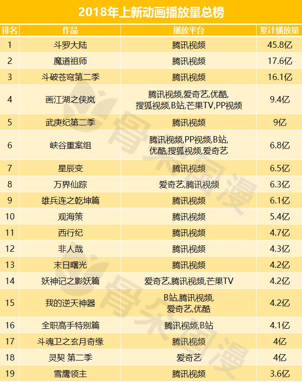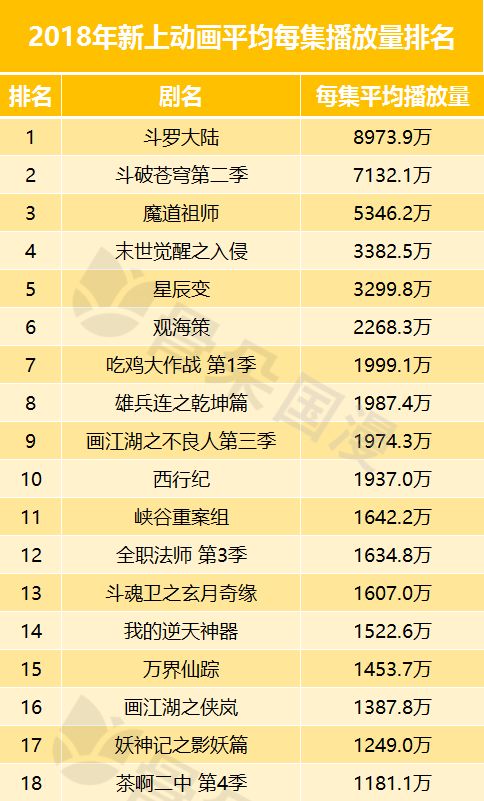 从《2018年新上动画平均每集播放量排名》对榜单来看,前三名与《2018年上新动画播放量总榜》一致。