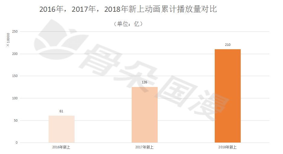 从图中看出,2016年到2018年每年的播放量都有接近翻倍的增长。而2018年在作品数量与2017年基本持平的情况下,播放量的实现了可观的增长,反映了国产动画产业的快速发展。