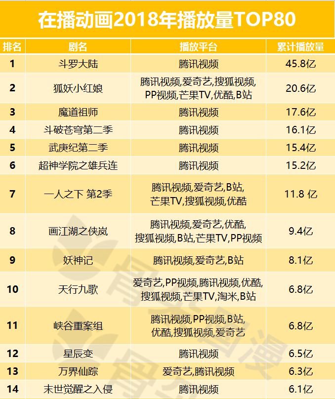 从《2018年在播动画播放量TOP80》的榜单中我们发现,前十当中有《狐妖小红娘》《武庚纪》《超神学院之雄兵连》《一人之下 第2季》《妖神记》《天行九歌》6部动画为2018年前上线作品。