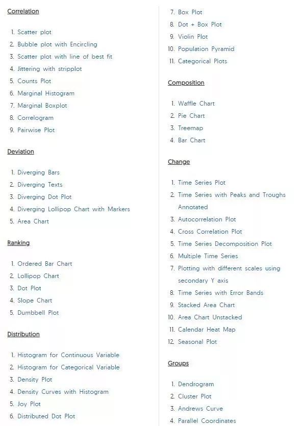 这些图表根据可视化目标的7个不同情景进行分组。 例如,如果要想象两个变量之间的关系,请查看“关联”部分下的图表。 或者,如果您想要显示值如何随时间变化,请查看“变化”部分,依此类推。