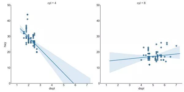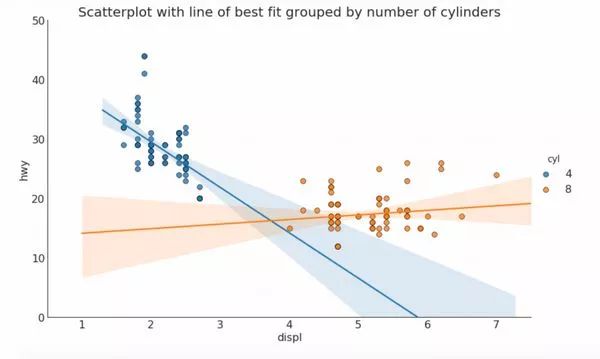 如果你想了解两个变量如何相互改变,那么最佳拟合线就是常用的方法。 下图显示了数据中各组之间最佳拟合线的差异。 要禁用分组并仅为整个数据集绘制一条最佳拟合线,请从下面的 sns.lmplot()调用中删除 hue =’cyl’参数。