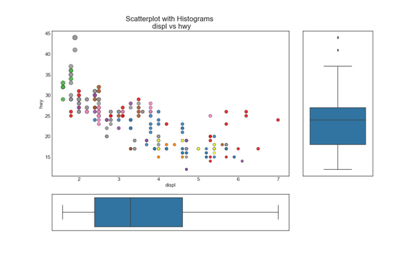 边缘箱图与边缘直方图具有相似的用途。 然而,箱线图有助于精确定位 X 和 Y 的中位数、第25和第75百分位数。
