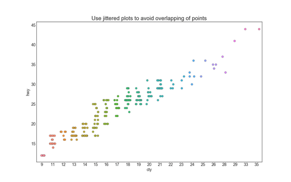 通常,多个数据点具有完全相同的 X 和 Y 值。 结果,多个点绘制会重叠并隐藏。 为避免这种情况,请将数据点稍微抖动,以便您可以直观地看到它们。 使用 seaborn 的 stripplot() 很方便实现这个功能。