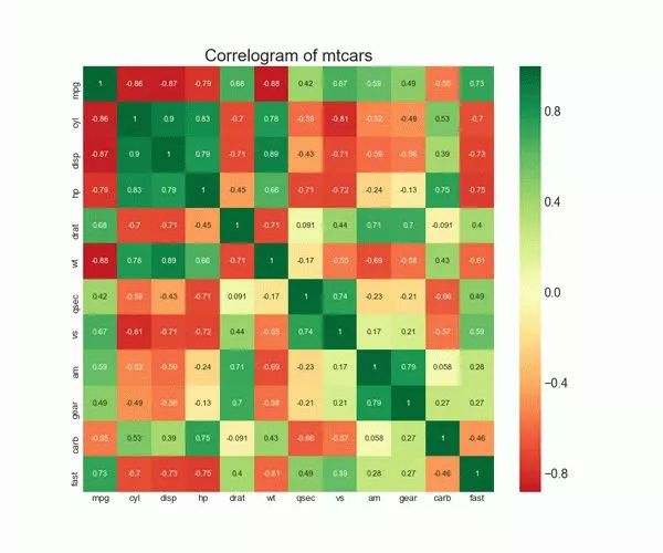 相关图用于直观地查看给定数据框(或二维数组)中所有可能的数值变量对之间的相关度量。