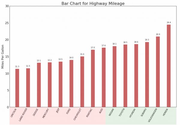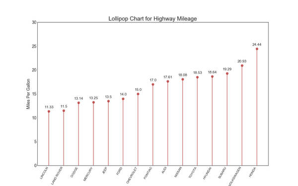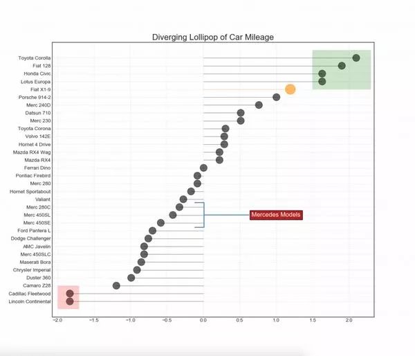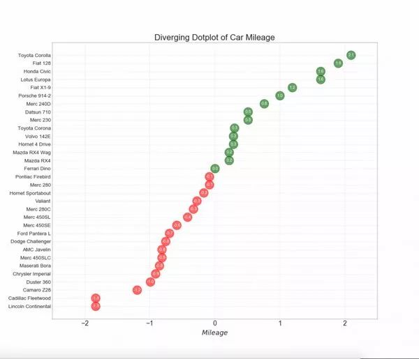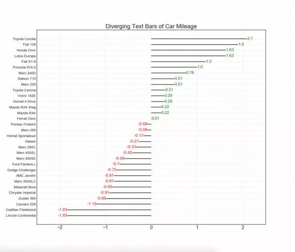 发散型文本 (Diverging Texts)与发散型条形图 (Diverging Bars)相似,如果你想以一种漂亮和可呈现的方式显示图表中每个项目的价值,就可以使用这种方法。