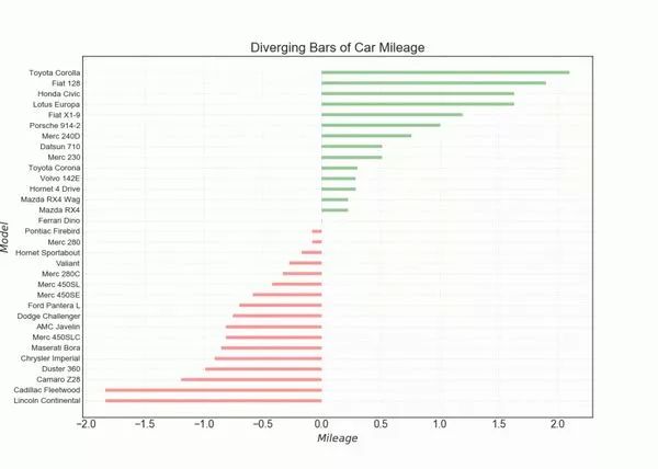 如果您想根据单个指标查看项目的变化情况,并可视化此差异的顺序和数量,那么散型条形图 (Diverging Bars) 是一个很好的工具。 它有助于快速区分数据中组的性能,并且非常直观,并且可以立即传达这一点。