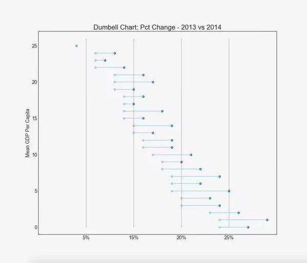 哑铃图表传达了各种项目的“前”和“后”位置以及项目的等级排序。 如果您想要将特定项目/计划对不同对象的影响可视化,那么它非常有用。