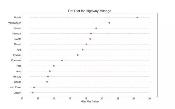 发散型包点图 (Diverging Dot Plot)也类似于发散型条形图 (Diverging Bars)。 然而,与发散型条形图 (Diverging Bars)相比,条的缺失减少了组之间的对比度和差异。