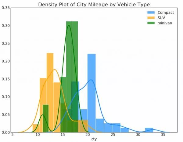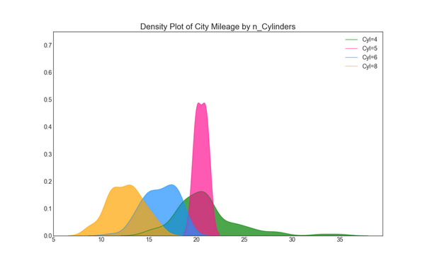 密度图是一种常用工具,用于可视化连续变量的分布。 通过“响应”变量对它们进行分组,您可以检查 X 和 Y 之间的关系。以下情况用于表示目的,以描述城市里程的分布如何随着汽缸数的变化而变化。