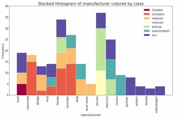 类型变量的直方图显示该变量的频率分布。 通过对条形图进行着色,可以将分布与表示颜色的另一个类型变量相关联。
