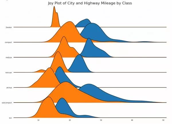 Joy Plot允许不同组的密度曲线重叠,这是一种可视化大量分组数据的彼此关系分布的好方法。 它看起来很悦目,并清楚地传达了正确的信息。 它可以使用基于 matplotlib 的 joypy 包轻松构建。