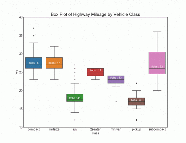 箱形图是一种可视化分布的好方法,记住中位数、第25个第45个四分位数和异常值。 但是,您需要注意解释可能会扭曲该组中包含的点数的框的大小。 因此,手动提供每个框中的观察数量可以帮助克服这个缺点。