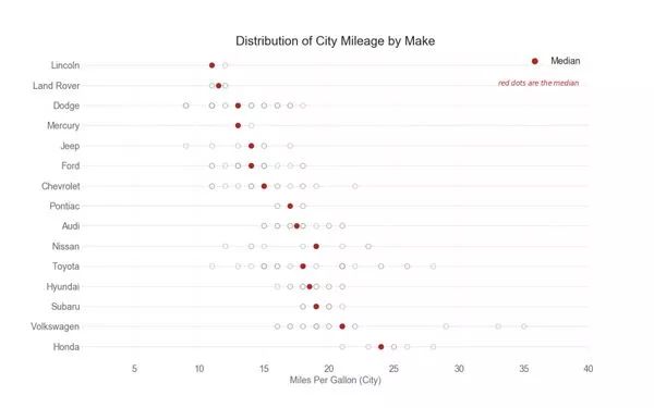 包点图表传达了项目的排名顺序,并且由于它沿水平轴对齐,因此您可以更容易地看到点彼此之间的距离。