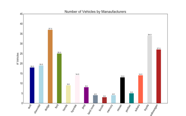 条形图是基于计数或任何给定指标可视化项目的经典方式。 在下面的图表中,我为每个项目使用了不同的颜色,但您通常可能希望为所有项目选择一种颜色,除非您按组对其进行着色。 颜色名称存储在下面代码中的all_colors中。 您可以通过在 plt.plot()中设置颜色参数来更改条的颜色。