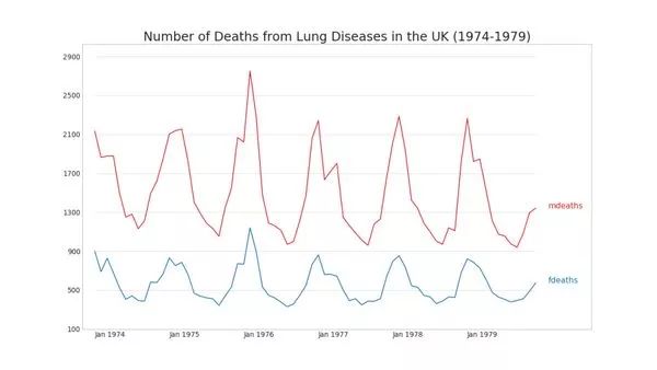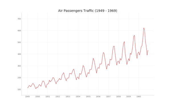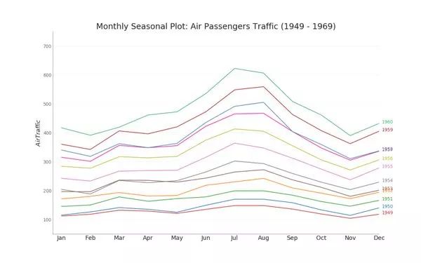 时间序列图用于显示给定度量随时间变化的方式。 在这里,您可以看到 1949年 至 1969年间航空客运量的变化情况。
