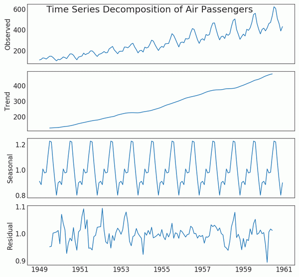 时间序列分解图显示时间序列分解为趋势,季节和残差分量。