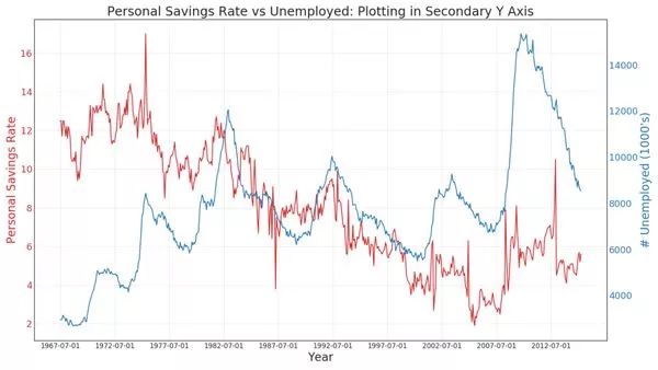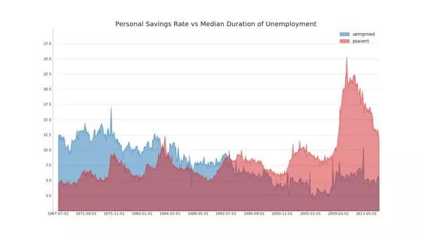 未堆积面积图用于可视化两个或更多个系列相对于彼此的进度(起伏)。 在下面的图表中,您可以清楚地看到随着失业中位数持续时间的增加,个人储蓄率会下降。 未堆积面积图表很好地展示了这种现象。