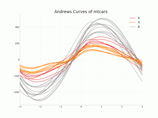 安德鲁斯曲线有助于可视化是否存在基于给定分组的数字特征的固有分组。 如果要素(数据集中的列)无法区分组(cyl),那么这些线将不会很好地隔离,如下所示。
