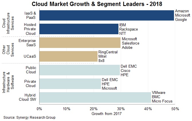 Synergy Research Group的新数据显示,在七个关键的云服务和基础设施细分市场中,2018年运营商和供应商的收入超过了2500亿美元,比2017年增长了32%。IaaS和PaaS服务的增长率最高,分别为50%,其次是混合云管理软件(41%)、企业SaaS和公共云基础架构(30%)、托管私有云基础架构服务(29%)。