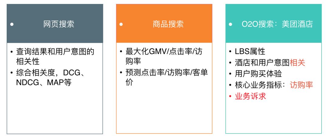 上图对不同搜索进行了简单对比,可以从5个维度展开。首先是目标维度。因为用户是来找信息,网页搜索重点是保证查询结果和用户意图的相关性,而在商品搜索和酒店搜索中,用户的主要目的是查找商品或服务,最终达成交易,目标上有较大区别。用户使用不同搜索的目的不同,从而导致不同搜索对个性化程度的要求不同。交易属性的搜索,包括商品搜索和酒店搜索,对个性化程度的要求都比较高,因为不同用户的消费水平不同,偏好也不一样。