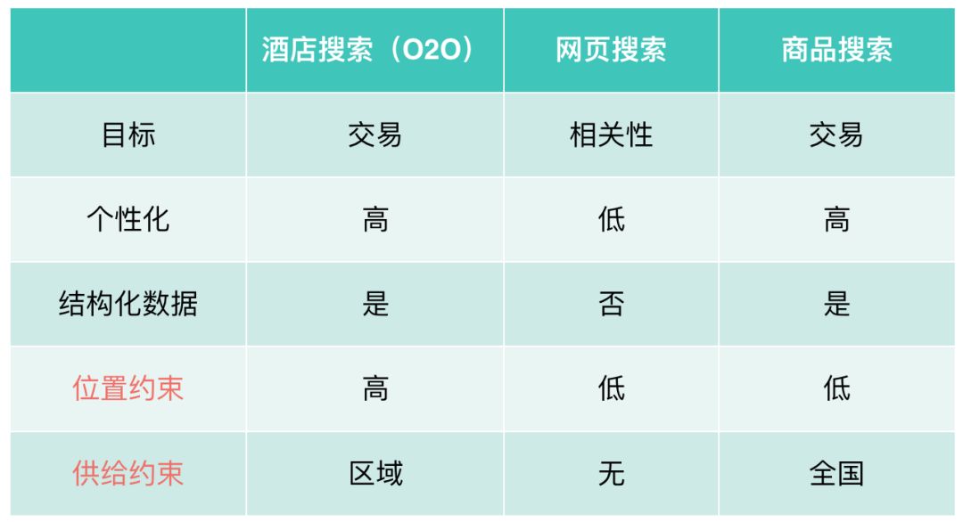 此外,酒店作为一种O2O的服务,用户在线上(Online)下单,最终需要到线下(Offline)去消费,所以就有一个位置上的约束,而位置的约束也就导致出现供给侧的约束,供给只能在某个特定位置附近。比如北京大学方圆几公里之内的酒店。这两点约束在网页搜索和商品搜索中就不用考虑,网页可以无限次的进行阅读。商品搜索得益于快递业的快速发展,在北京也可以买到来自浙江的商品,供给侧的约束比较小。